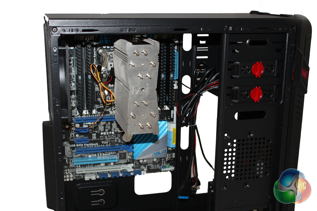 There is a large cut out area in the motherboard tray to facilitate CPU cooler installation, although we would usually recommend attaching it to the motherboard before installing it into the case.