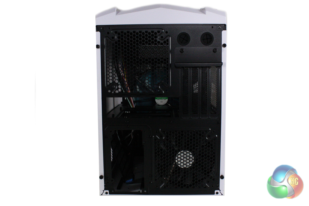 Moving around to the rear of the case we start to get an idea of the internal layout of the case. We can see that the motherboard inside lies horizontally within the case, sitting on top of the power supply and a 120mm exhaust fan vent. There is an additional rear fan vent at the top which can be populated with either 120mm or 140mm units.