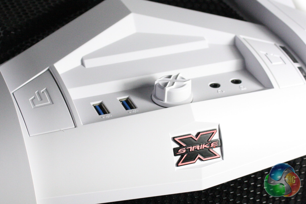 The front panel connections are located on the top of the case at the front. From left to right we find two USB 3.0 ports, a fan controller dial and headphone and microphone jacks. These are flanked by the power and reset buttons on either side.