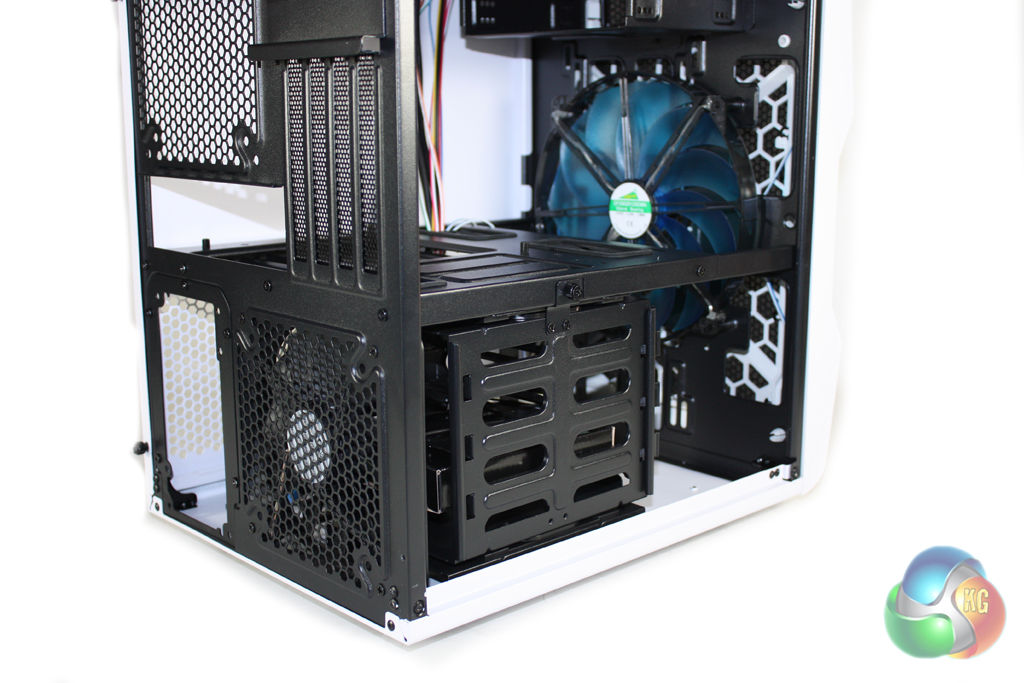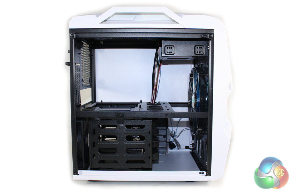 The interior of the Aerocool Strike-X Cube is painted in a combination of black and white, and is divided into two separate sections. The top section of the case is where the motherboard is installed, with the hard drive bays and power supply mountings located underneath the motherboard tray.