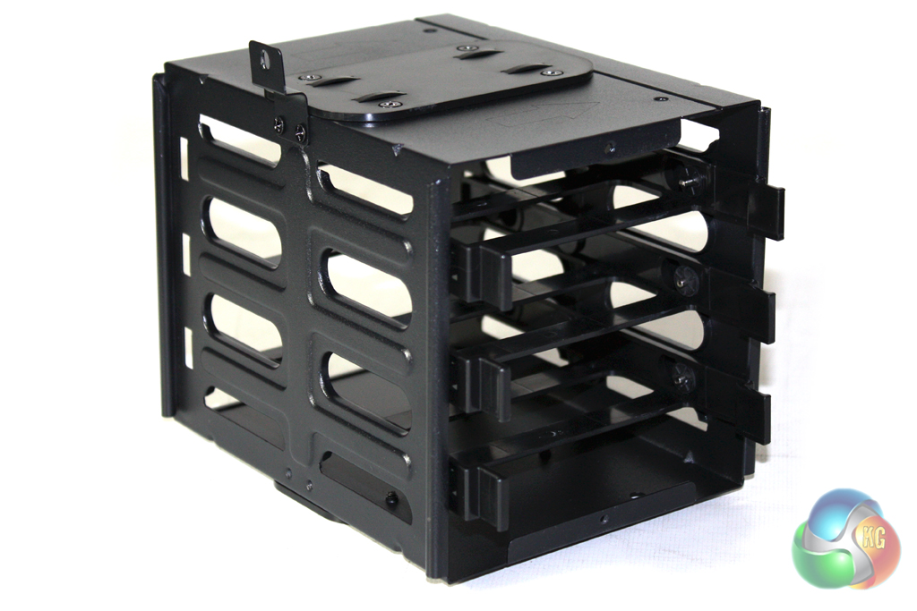 There are two thumbscrews holding the hard drive cage in place, which can hold up to three hard drives in total. Each hard drive sits within its own plastic tray, which has mounting points for both 2.5” and 3.5” drive models.