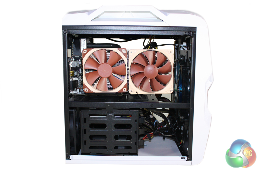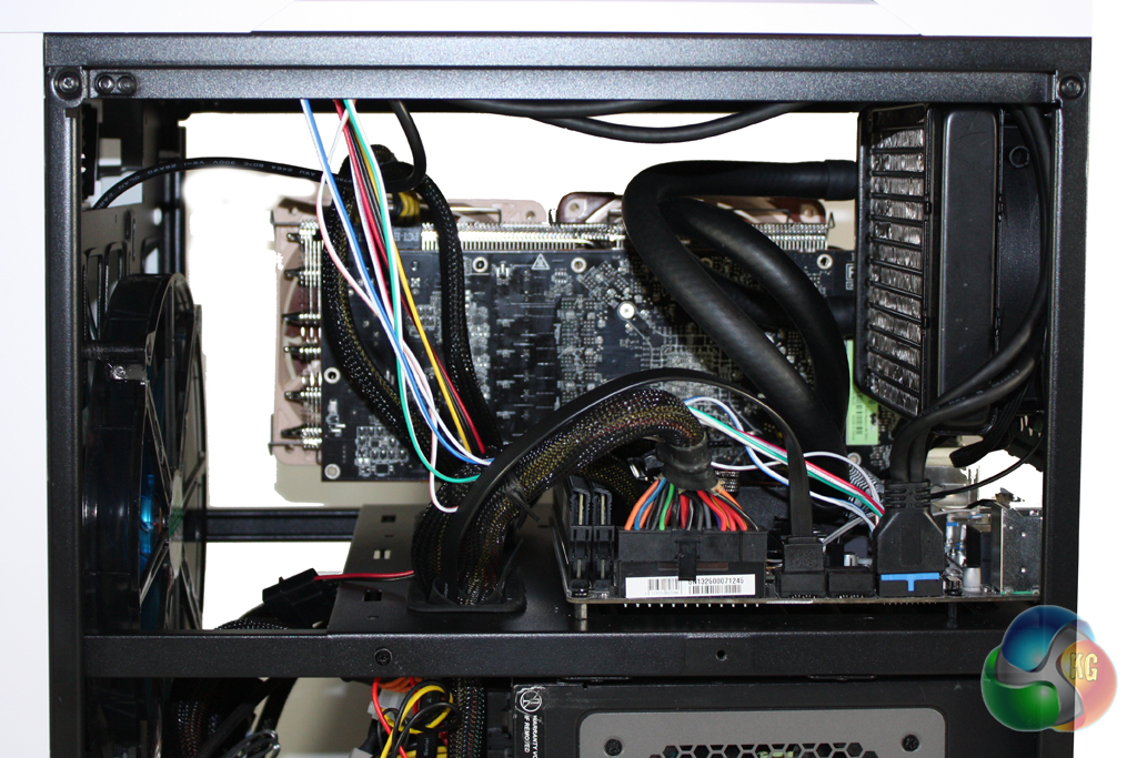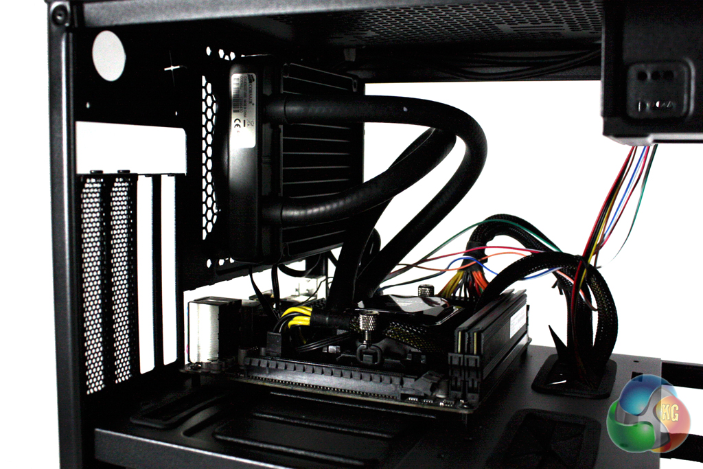 There is a reasonable amount of headroom for large air coolers, but we chose to install an all-in-one water cooling unit instead. The Corsair H75 fits comfortably to the rear exhaust vent of the case, and could be attached to the roof of the case if desired.