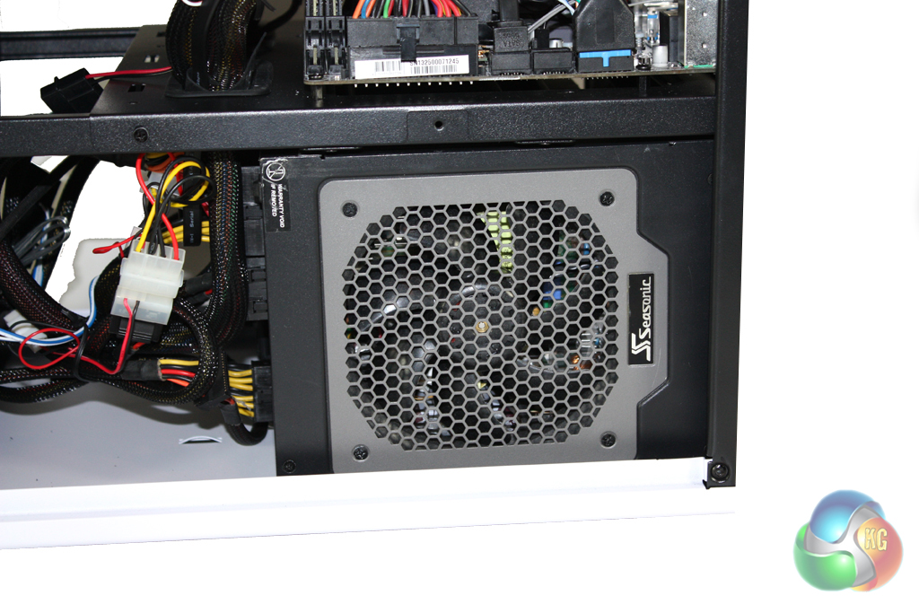 Behind the hard drive cage we find the power supply mounting points. There is plenty of room for large power supplies in the case – even for our larger-than-average Seasonic Platinum 1000W. Cable routing options are limited, though, due to the unusual internal design of the case. It would take a substantial investment of time to achieve a really tidy build in this case.