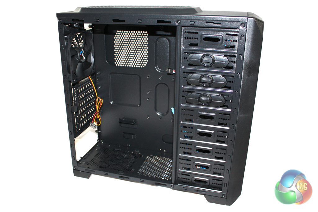 The drive bays are located on the right hand side of the interior, and provide very flexible configuration options. There are five hard drive trays included which will let you install both 2.5″ and 3.5″ units. All eight of the bays can also support 5.25″ drive bays. The main drawback of this configuration lies with the orientation of the drive bays. As they point towards the front of the case, it can be very difficult to change drives over once you have installed all of the other components into the system.