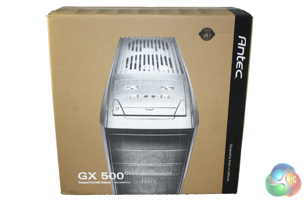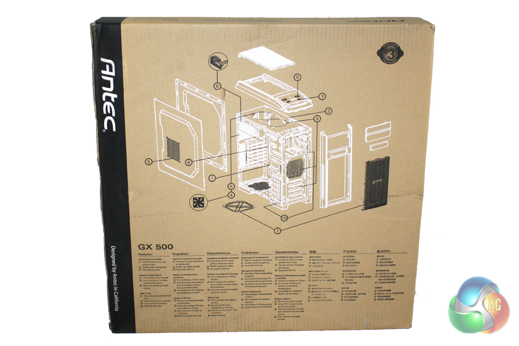 The Antec GX500 is supplied in a standard case box which is decorated in a black, brown and white livery. The front of the box features a large image of the case to give you an idea of what it looks like before opening.