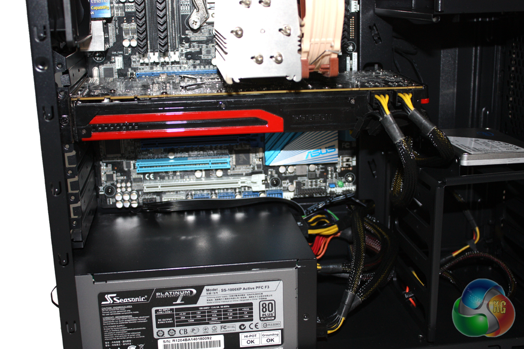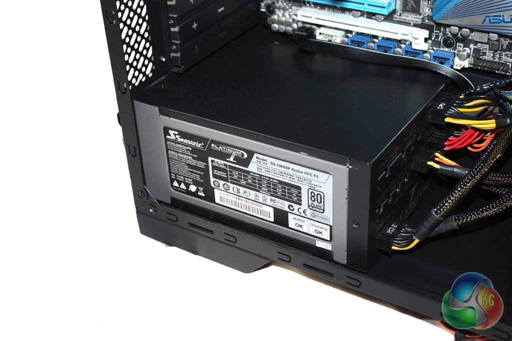 There is a generous amount of room in this case for longer power supplies. The Seasonic Platinum 1000W that we selected for our test system is slightly longer than a standard ATX model and obstructed one of the cable routing holes slightly. The other hole was sizable enough for all the cables however. The only time we could envisage an issue would be with a larger, non modular power supply.