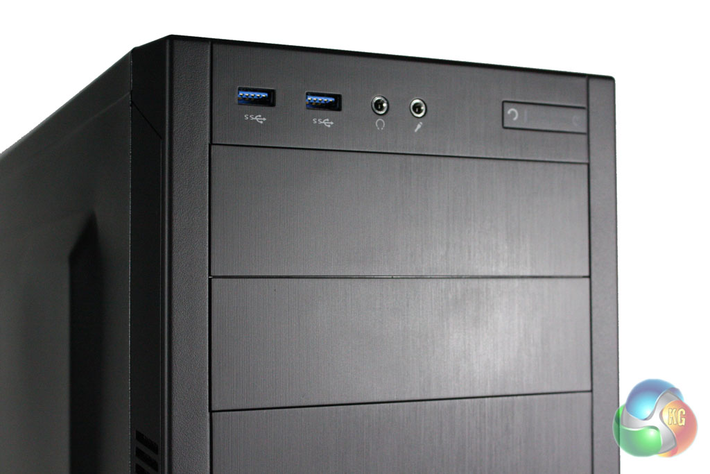 At the top of the front panel we find the front panel connectors. From left to right we find two USB 3.0 ports, headphone and microphone jacks, a reset button and the power button.