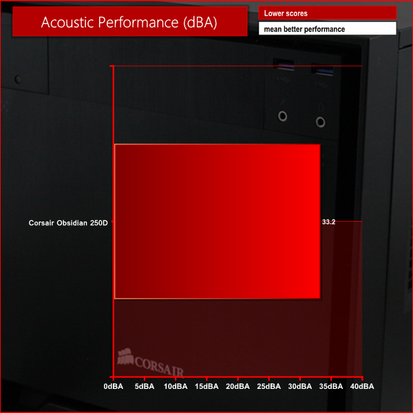 This graph shows that the Obsidian 250D remains fairly quiet, even when under load. This is particularly impressive for a case with so many air vents!