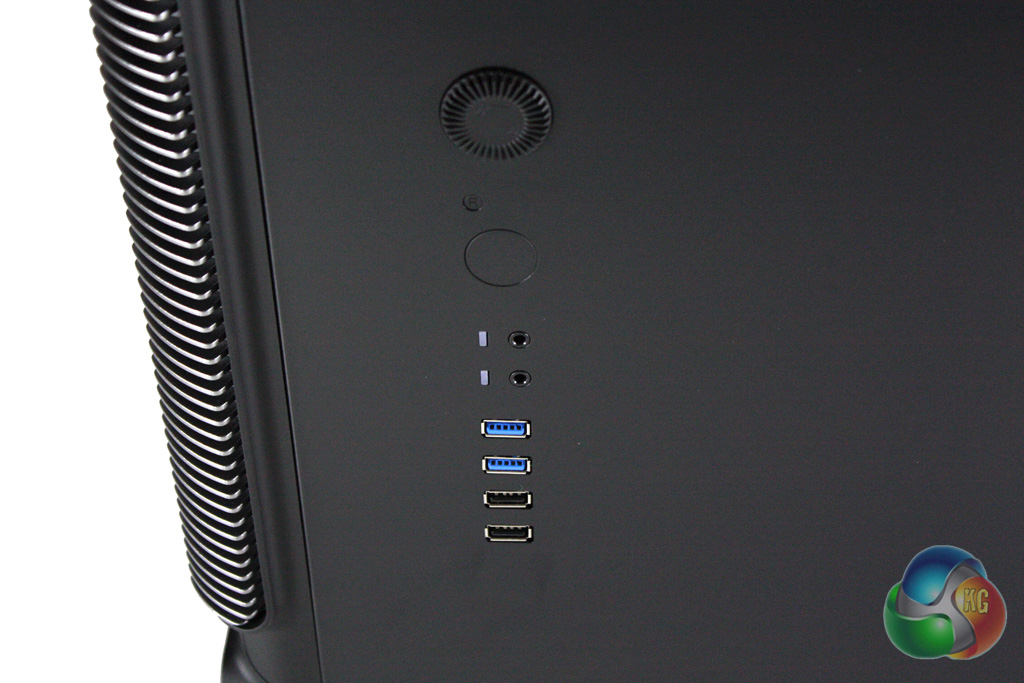 The front of the case is fairly simple in design, with the stand-out features from a design point of view being the fan vents on either side and the 5.25″ drive bay at the top which are all highlighted in silver paint. The remaining areas of the front panel are finished in black plastic.
