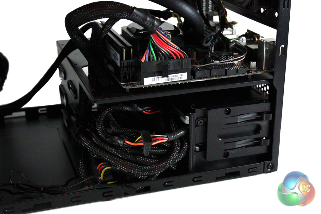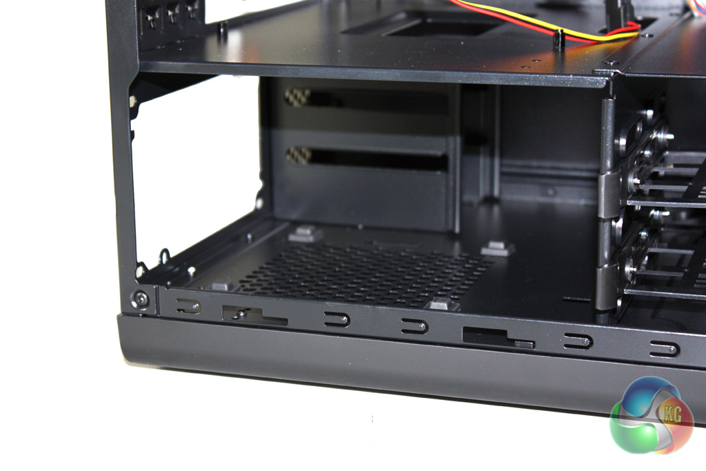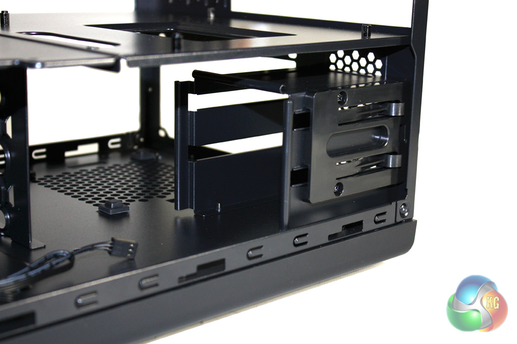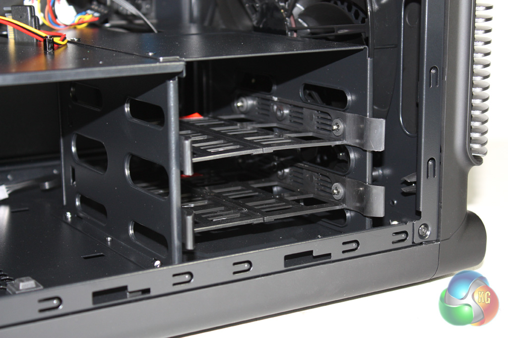 We find two hard drive cages located in the system, one for 3.5″ drives and one for 2.5″ drives. Both of these cages are removable and offer space for two of their respective drives. Removing the cages is actually a fairly complicated process as we have to remove the bottom panel of the case first, which is secured by a number of screws hidden underneath the rubber feet on the underside.