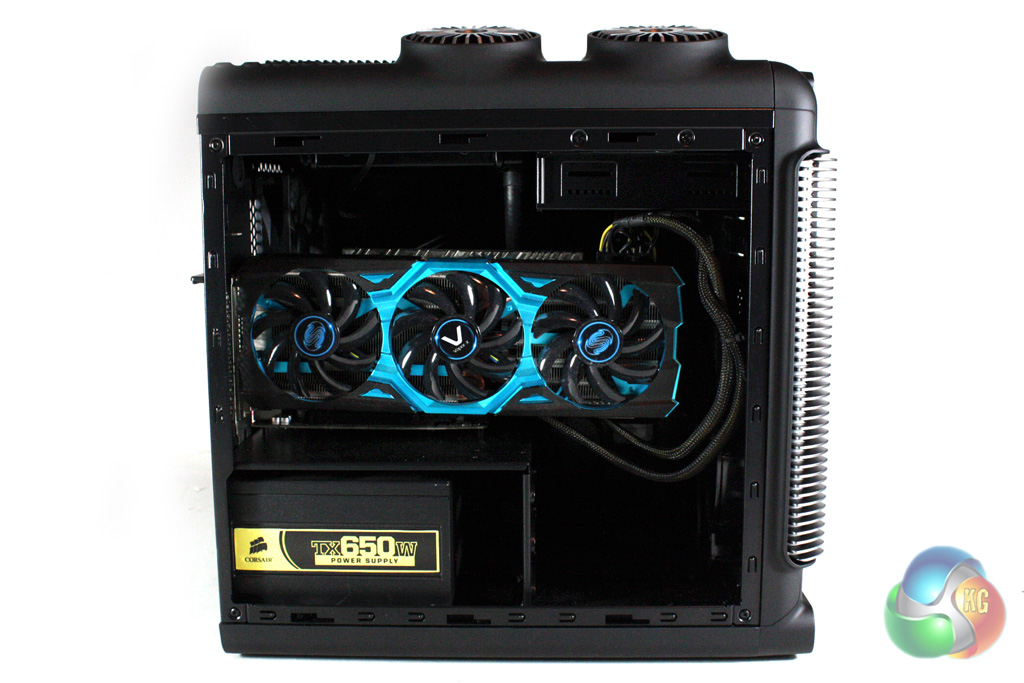 The last step of the process is to install the graphics card in the system. There is a generous amount of room for graphics cards, however we were forced to remove the external 3.5″ drive bay to manoeuvre the power supply cables into place.