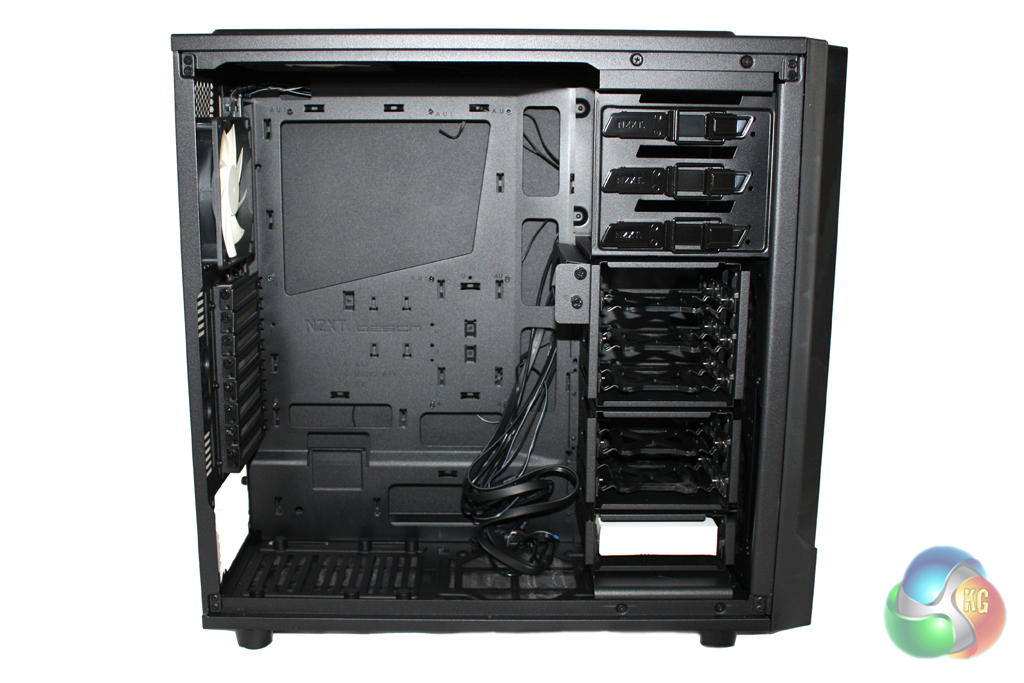 The internal layout of the case is standardised, with the modular hard drive bays located on the right hand side, below the external drive bays at the top. Each hard drive bay features a tray which allows you to install either a 2.5” or a 3.5” unit. There are six bays in total which are arranged in modules of three, two and one so that you can remove surplus bays to improve airflow.