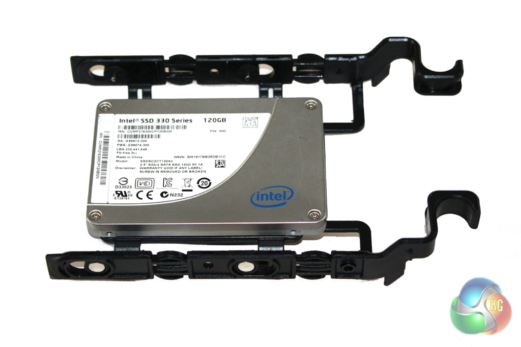 We installed an Intel 330 Series 120 GB solid state drive into the system, requiring four screws through the base of the tray. Installing a 3.5” drive would be simpler as you as the tray can grip it without needing screws.