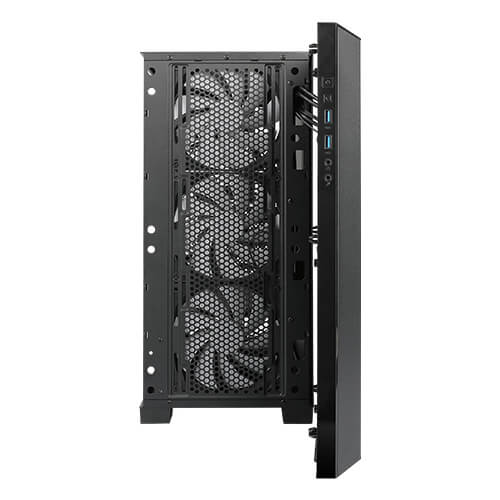 In terms of storage space, there is room for the installation of up to two 2.5” SSDs in the removable SSD rack with additional space for either two 2.5” or two 3.5” drives in the removable 3.5” HDD cage under the power supply shroud. A total of seven expansion slots at the rear of the case allow for graphics cards up to 380mm long to be installed inside. The front panel I/O consists of 3.5mm HD audio jacks with two USB 3.0 Type-A ports and power/reset buttons.