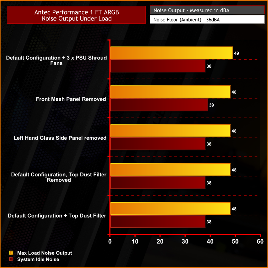 49dBA max noise output is very noticeable but it's not the highest we have seen from similar case testing, however fine tuning of fan curves might be required if you are working in a noise-sensitive environment.