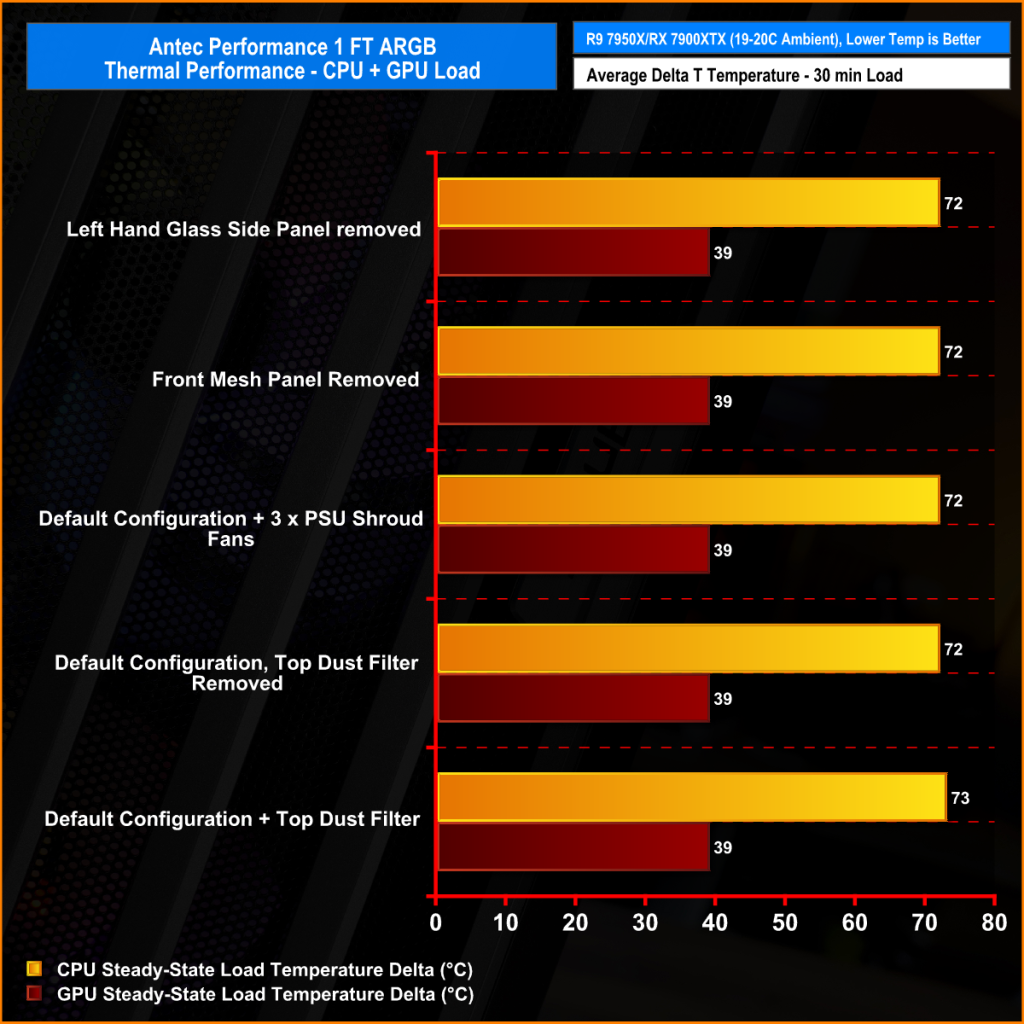 Changing the case configuration had little to no effect on either the CPU or GPU thermals. Removing side, front panels and dust filters as well as adding fans to the top of the power supply shroud made no difference to the hardware temperatures.