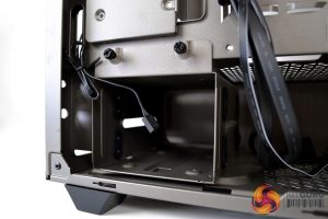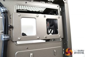 Ample space for storage devices is provided in the Pure Base 500. A double HDD cage is hidden underneath the PSU shroud and, as the name suggests, it fits up to two 3.5” drives. The HDD cage can be placed in three positions to provide extra clearance or removed completely.