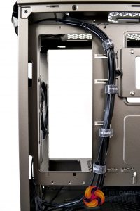 Up to two SSDs or 2.5” drives can be mounted out of sight behind the motherboard tray and two additional SSDs can be installed on the SSD panel to the right of the motherboard. Instead of two 3.5” HDDs in the double HDD cage, users can opt to mount a fifth SSD.