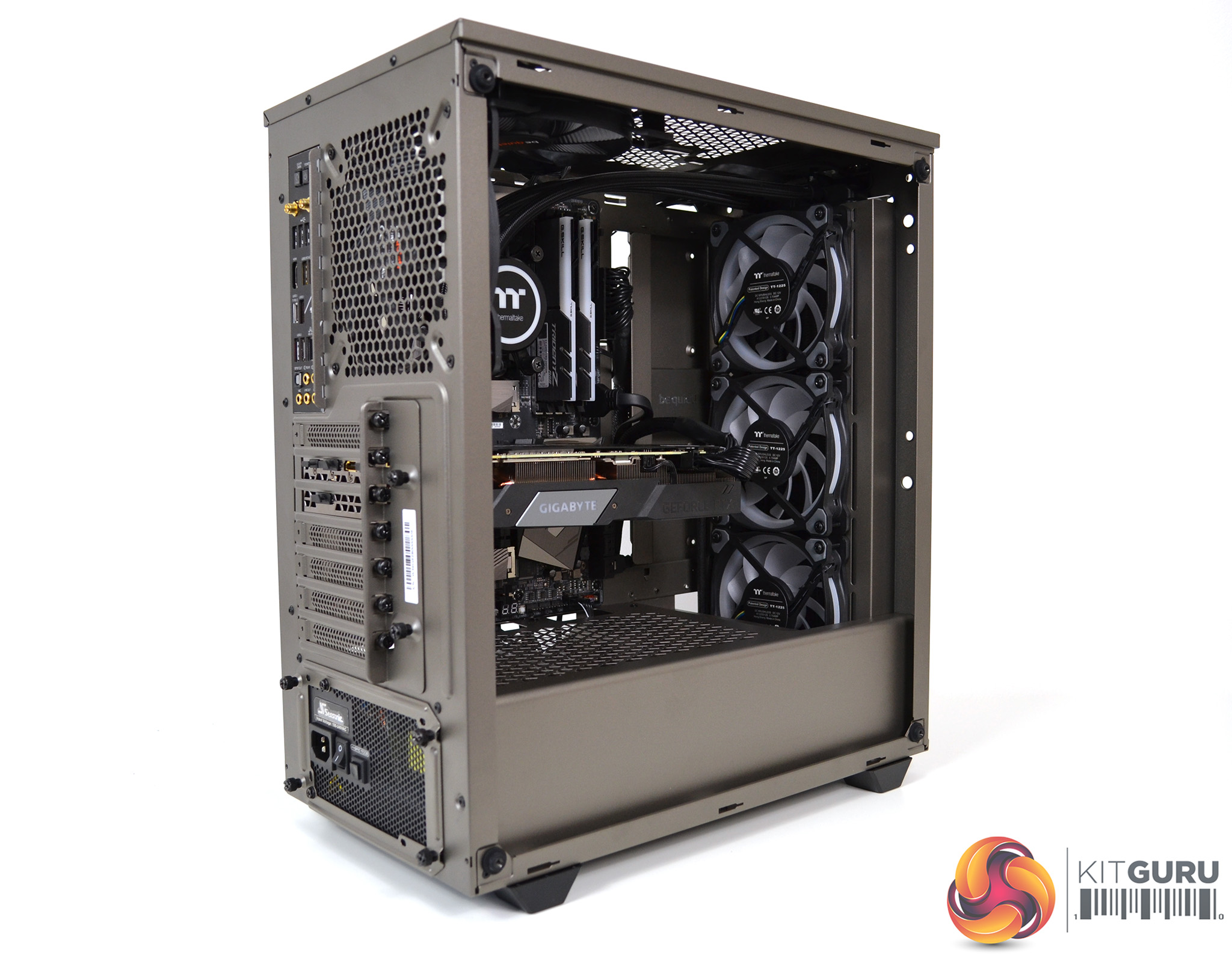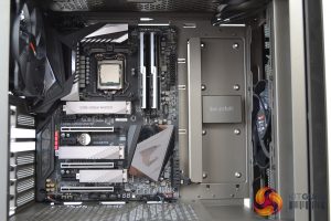 Installation of the motherboard created our first problem. Fitting of our Gigabyte Z390 Aorus Master was extremely tight. We had to remove both the rear fan and SSD panel to allow clearance to place the board in position. Even then we found it difficult to line up the motherboard to the stand offs – this may have been due to the armour back plate on the Aorus Master.