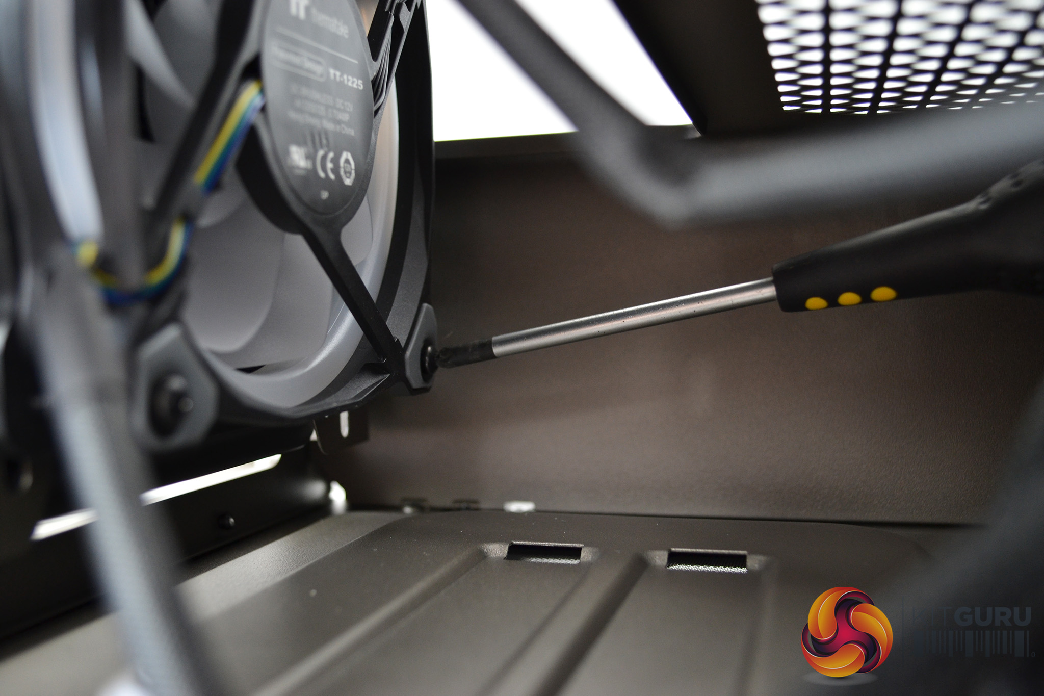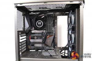 To test radiator clearance at the front of the case, we decided to fit a Thermaltake Floe DX 360mm AIO. Surprisingly this was very straight forward and once completed, there was still ample space to install the GPU. getting to the lower fan screws was tricky but not impossible.