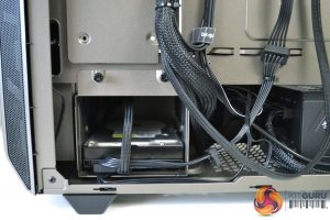Secondly, our main bugbear with the cable management is the cut out on the removable SSD panel. When installing the 24-pin power connector, we could not manipulate the cable through the cut out as we desired. So, either the cable was stuck out of the case side too far or it had to be angled downwards for clearance.