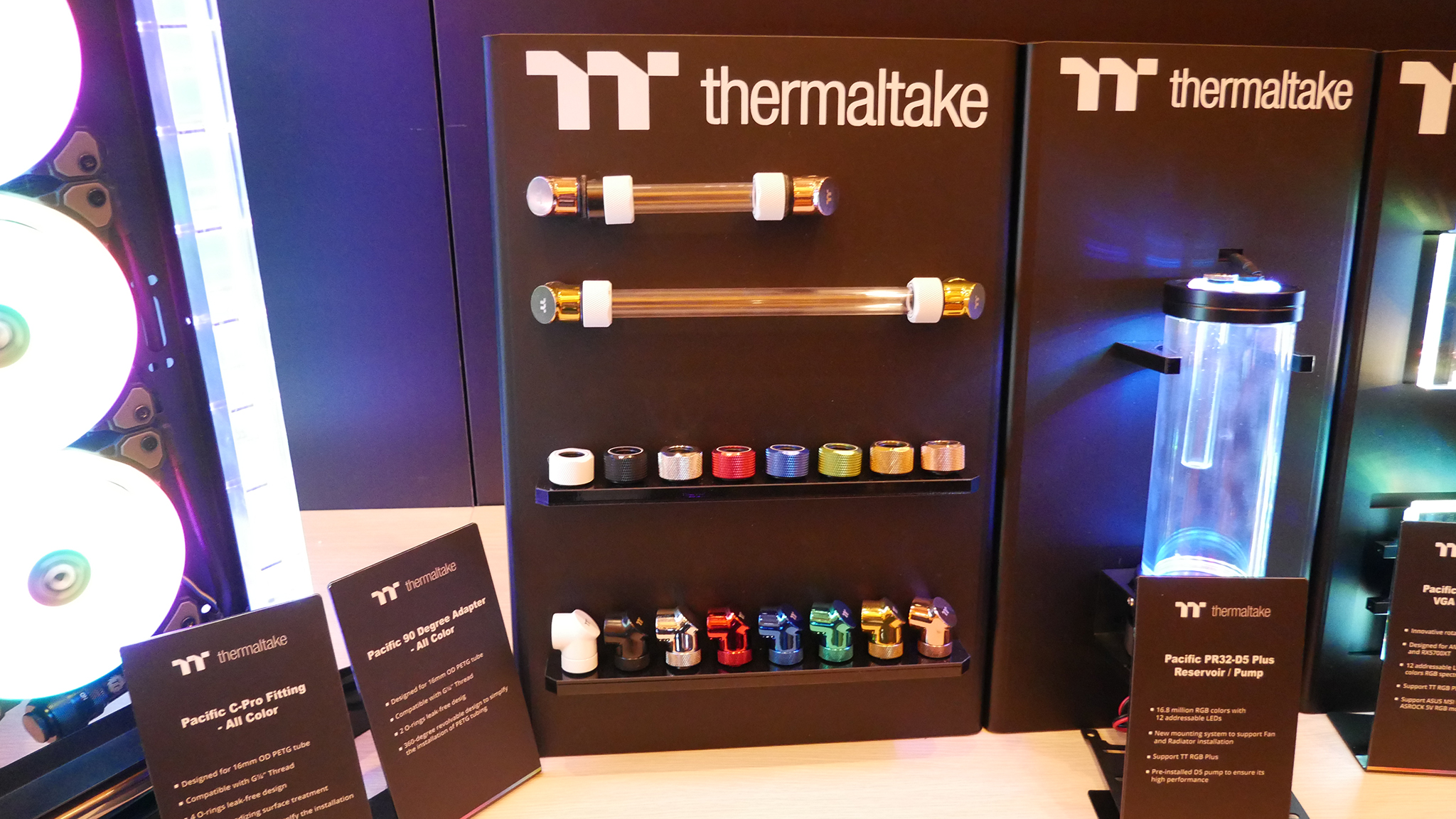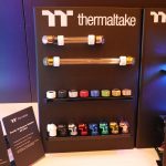 Thermaltake has a bunch of ToughPower power supplies on display at CES, Thermaltake has equipped its Gold rated power supplies with RGB LED lighting now. Moving back on to water cooling, Leo looks at Thermaltake’s C-Pro fittings which he regards as the “best on the market” due to their three-piece design which includes four O-ring seals. The C-Pro range is available in straight and 90° angles with various anodised colour finishes.