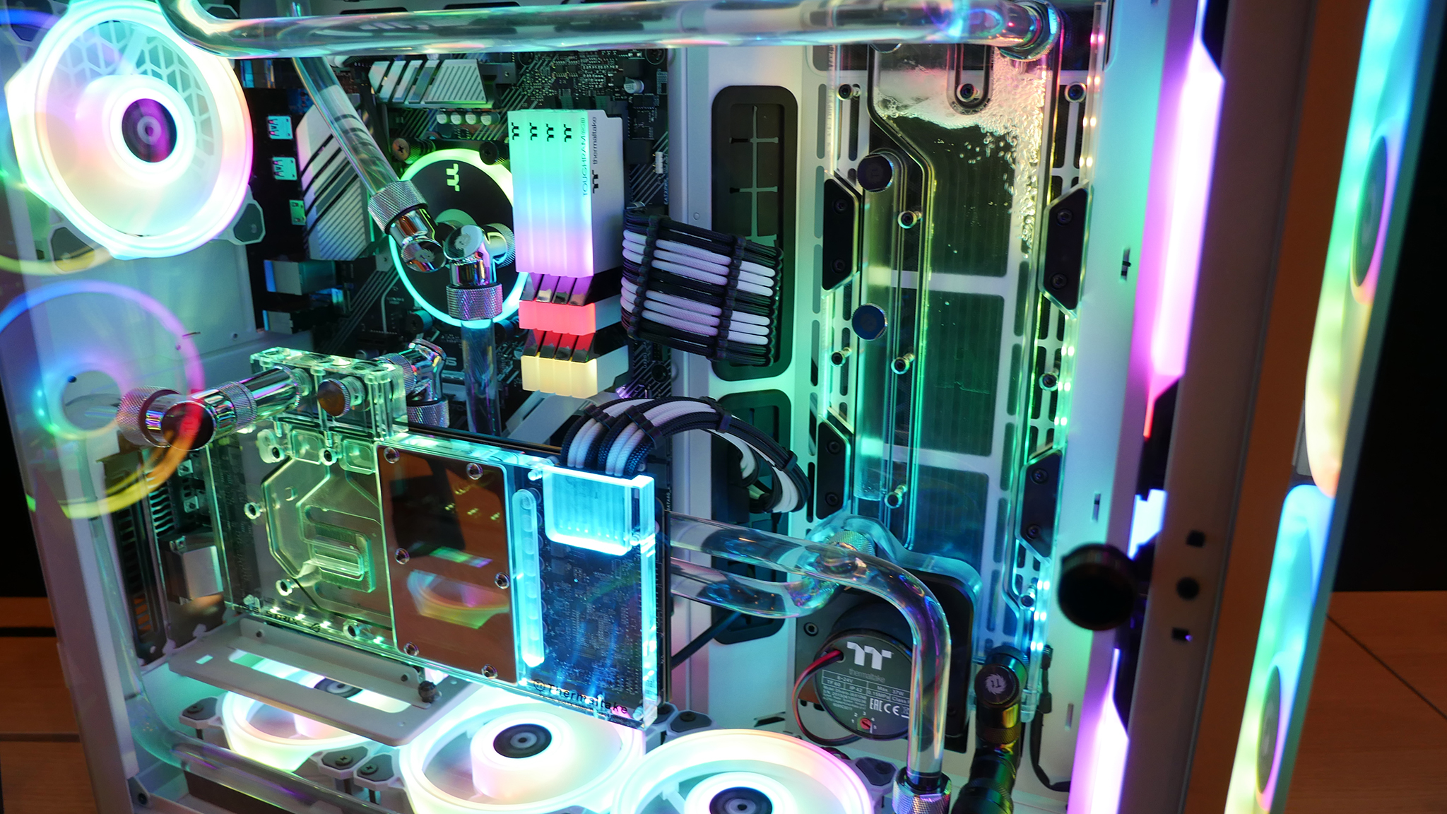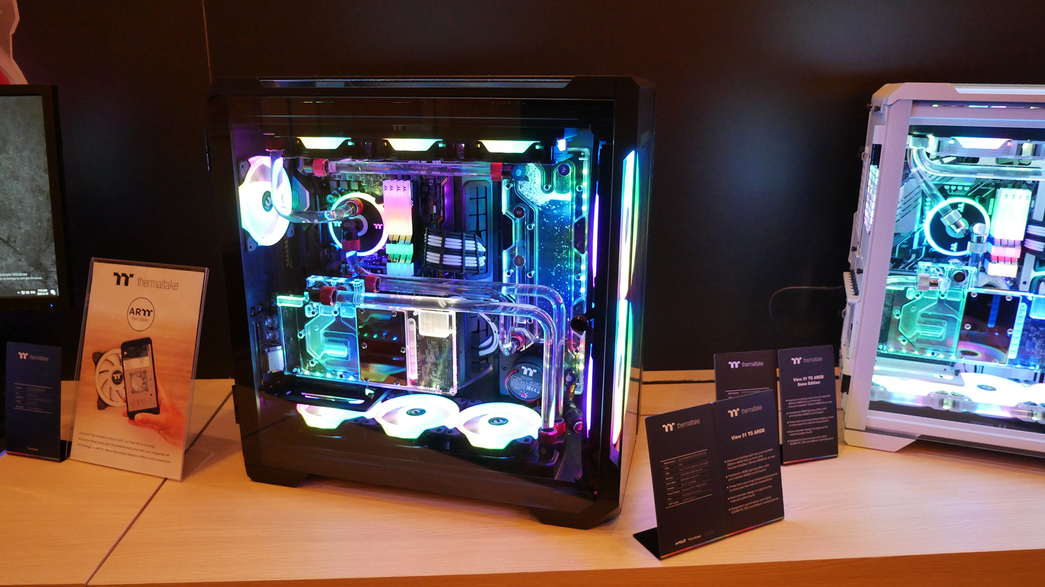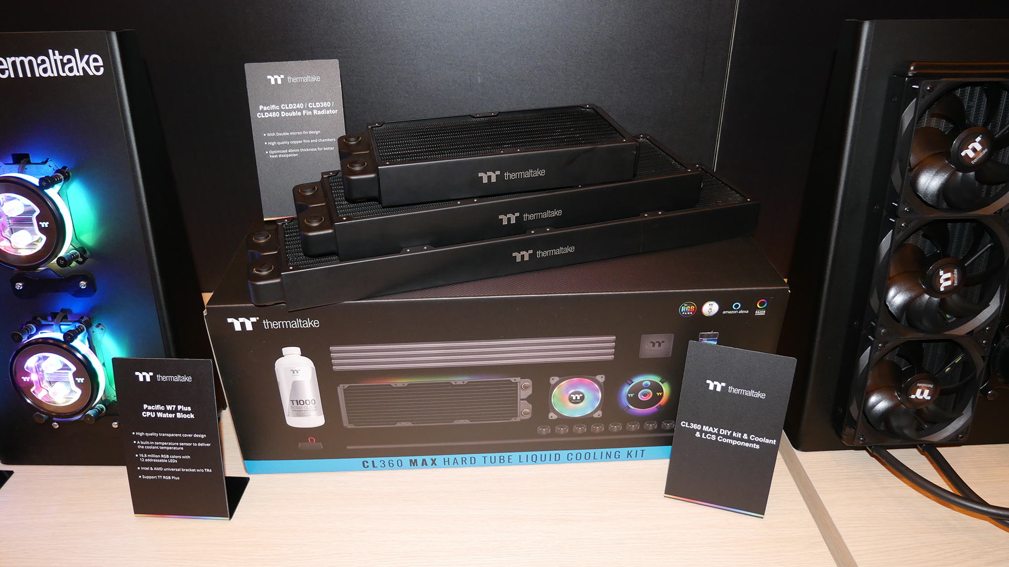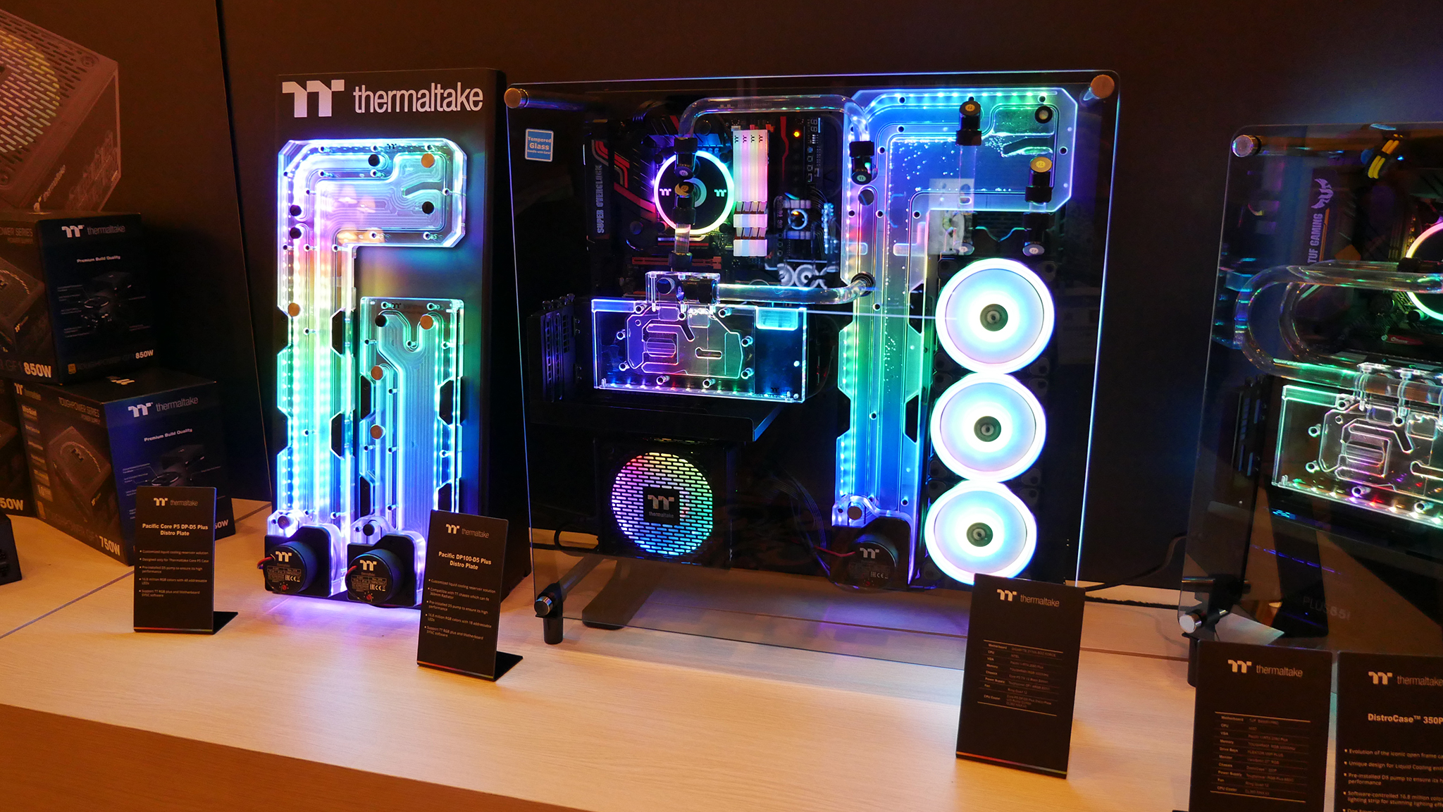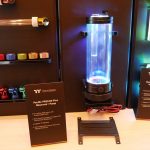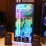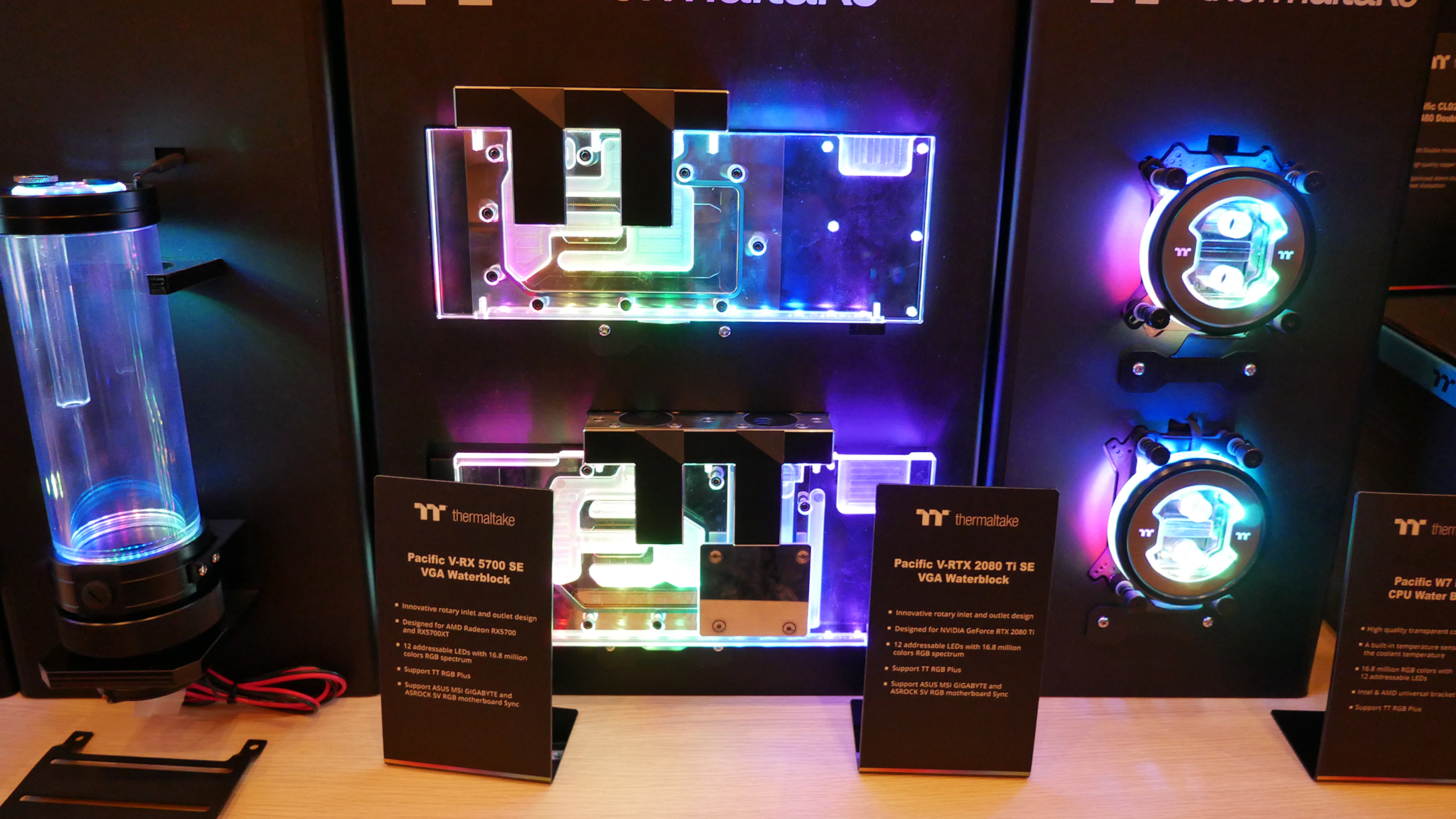 Continuing with the custom water cooling theme, Thermaltake has a new D5 pump reservoir combo available now. The Pacific PR32-D5 Plus combo features a wider design to provide increased capacity, with RGB lighting in the top and bottom and has a 120mm mounting bracket included. Some new CPU and GPU water blocks were on show at the Thermaltake booth, new Pacific V-RX 5700 SE and V-RTX 2080 Ti SE GPU blocks feature large manifolds with rotating G1/4 inserts to assist tubing alignment which looked interesting.