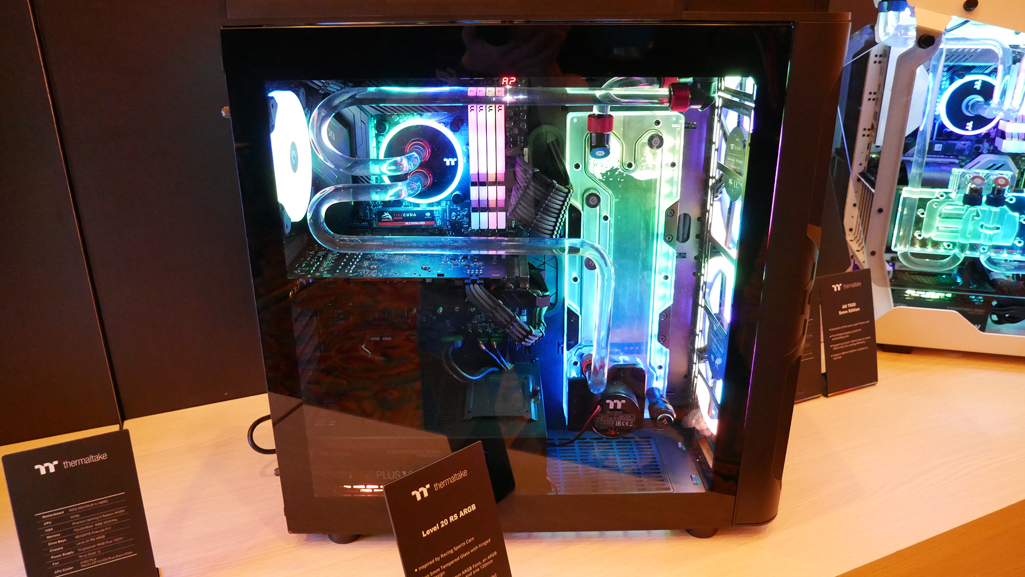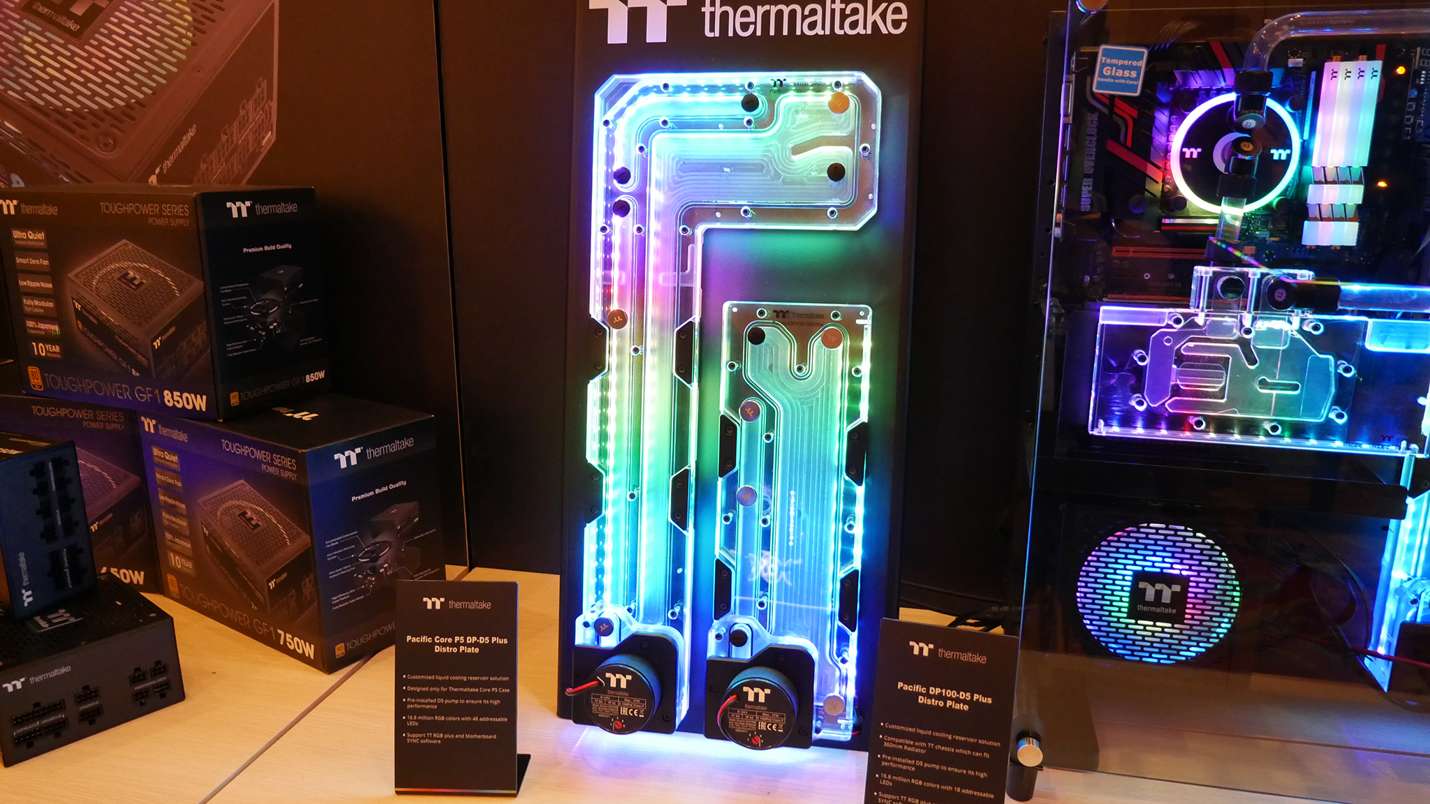 First off, Leo takes a look at the innovative new Distrocase 350P open chassis for water cooling which he describes as “mind blowing”, you can check out a full feature video of the Thermaltake Distrocase 350P for more details on that. Sticking with water cooling distribution plates, Thermaltake had the Pacific DP100-D5 Plus Distro Plate on show which is designed to universally fit a 360mm radiator and is equipped with a D5 pump, along with the Pacific Core P5 DP-D5. Designed specifically for the Thermaltake D5 open frame chassis, the Pacific Core P5 DP-D5 is installed in one of the P5 chassis radiator mounts and features a D5 pump and RGB LED lighting.