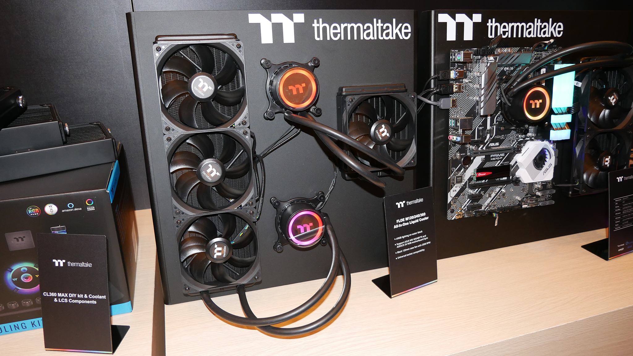 The new Thermaltake Pacific W7 Plus CPU blocks are aesthetic updates of existing products with a removable top section logo, RGB Led lighting and support current mainstream desktop platforms from Intel and AMD, but unfortunately not Threadripper. Thermaltake was also showcasing a new range of budget all-in-one CPU coolers, the Floe M120/240/360 series cuts back on RGB lighting in the fans to save a little on production costs which will hopefully be passed on to the consumer.