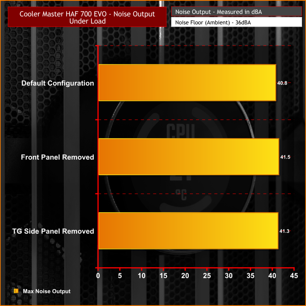 Noise levels are measured by placing a noise meter 300mm from the front of the chassis while the stress test is running and the peak noise level during the test is recorded. The noise floor (ambient noise level) in the room is 36dBA.