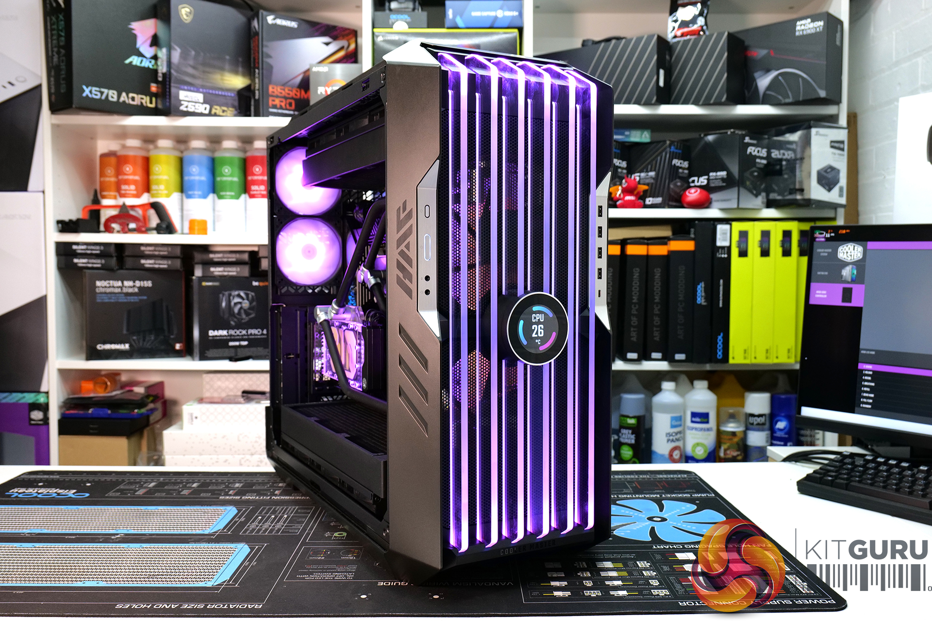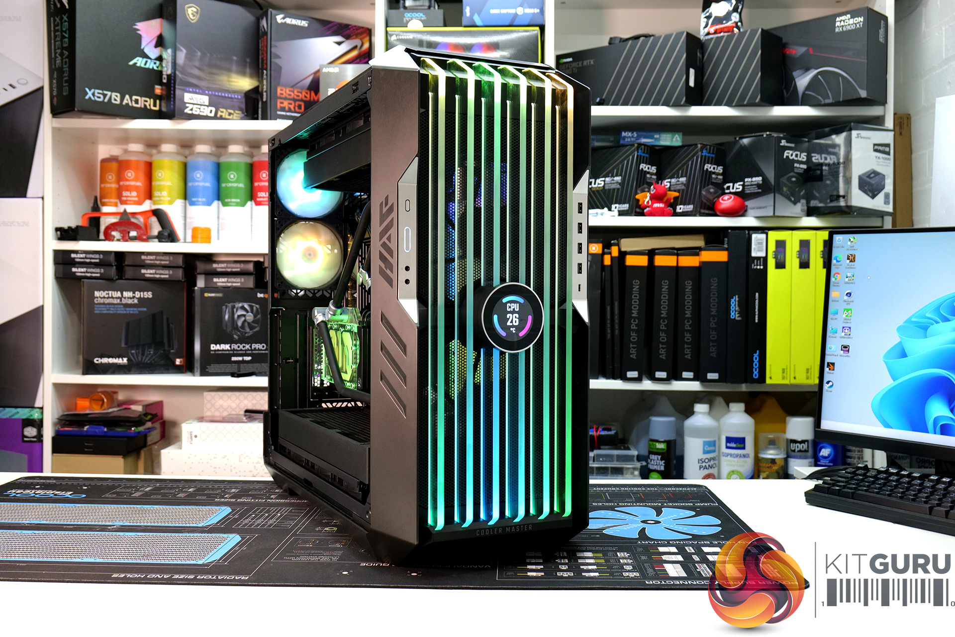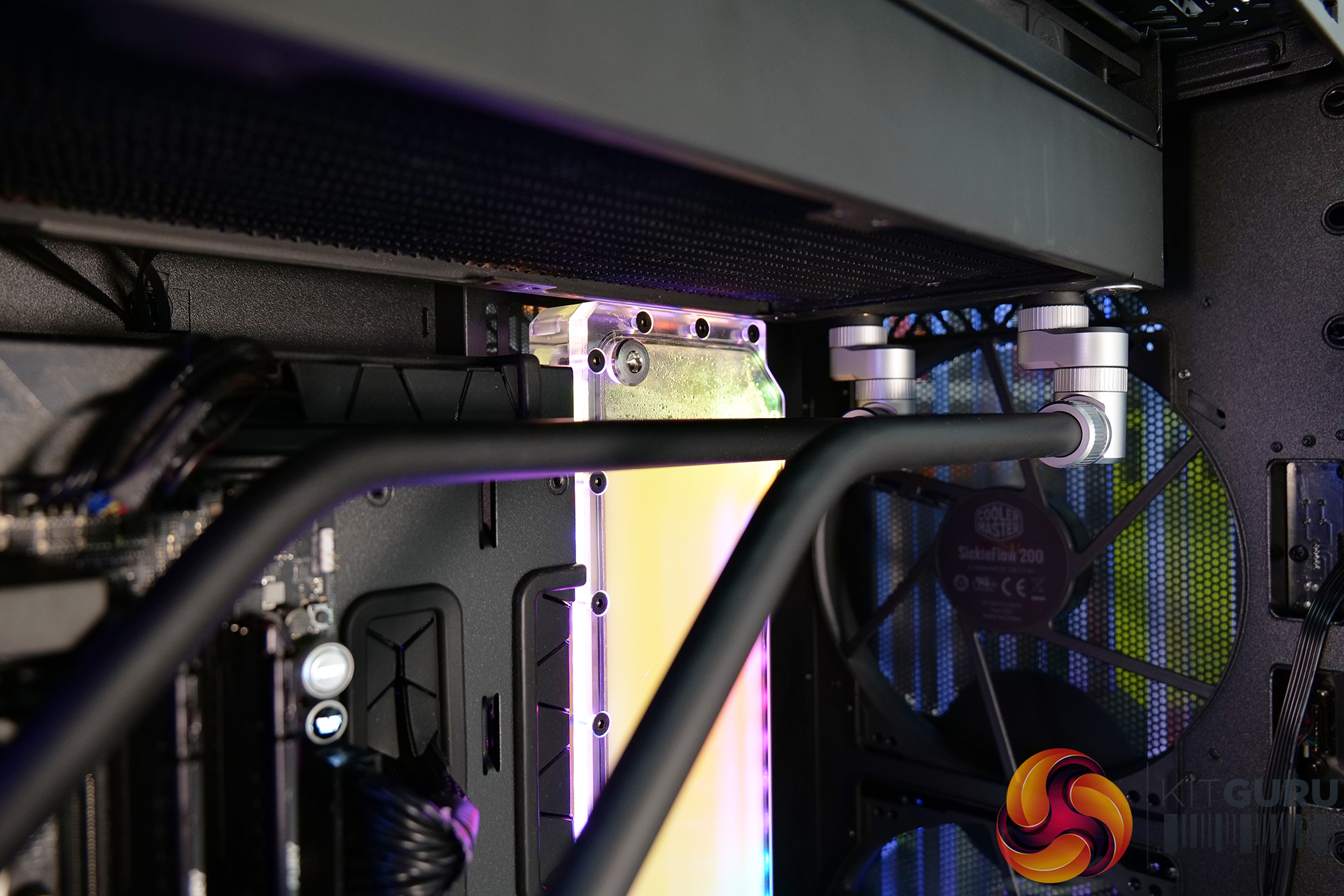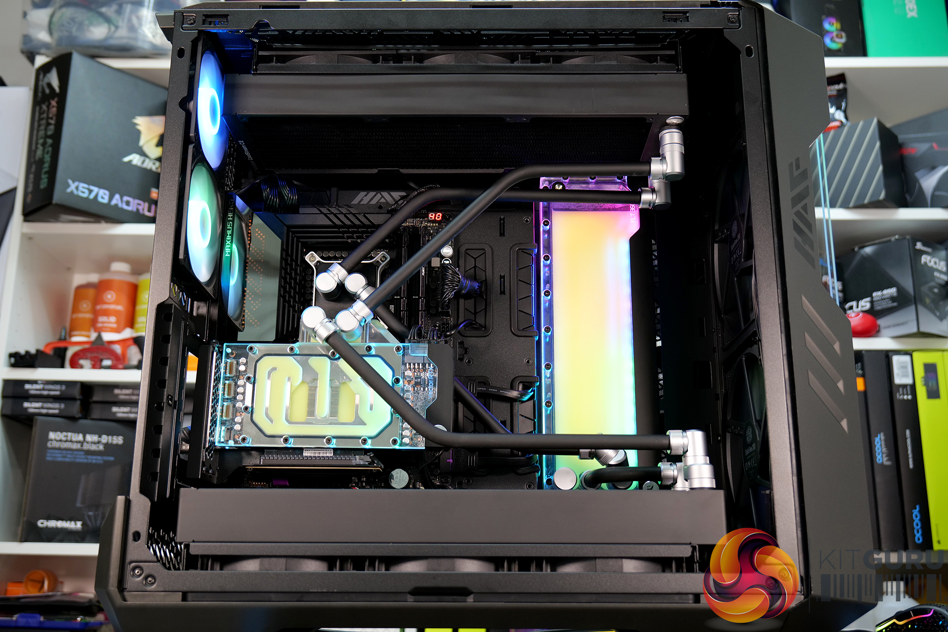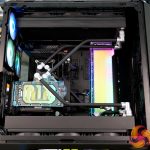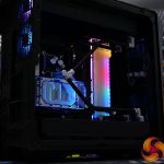 Overall though, it was a very pleasing experience installing a custom loop system inside this case. Our two 45mm-thick 420mm radiators were accommodated easily, along with the EK-Quantum Kinetic FLT 360 flat reservoir. The finished product looked great too, the EKWB RGB lighting could be easily hooked up to the chassis’ RGB controller and with minor tweaking in the Cooler Master MasterPlus+ software, the RGB synchronised perfectly.