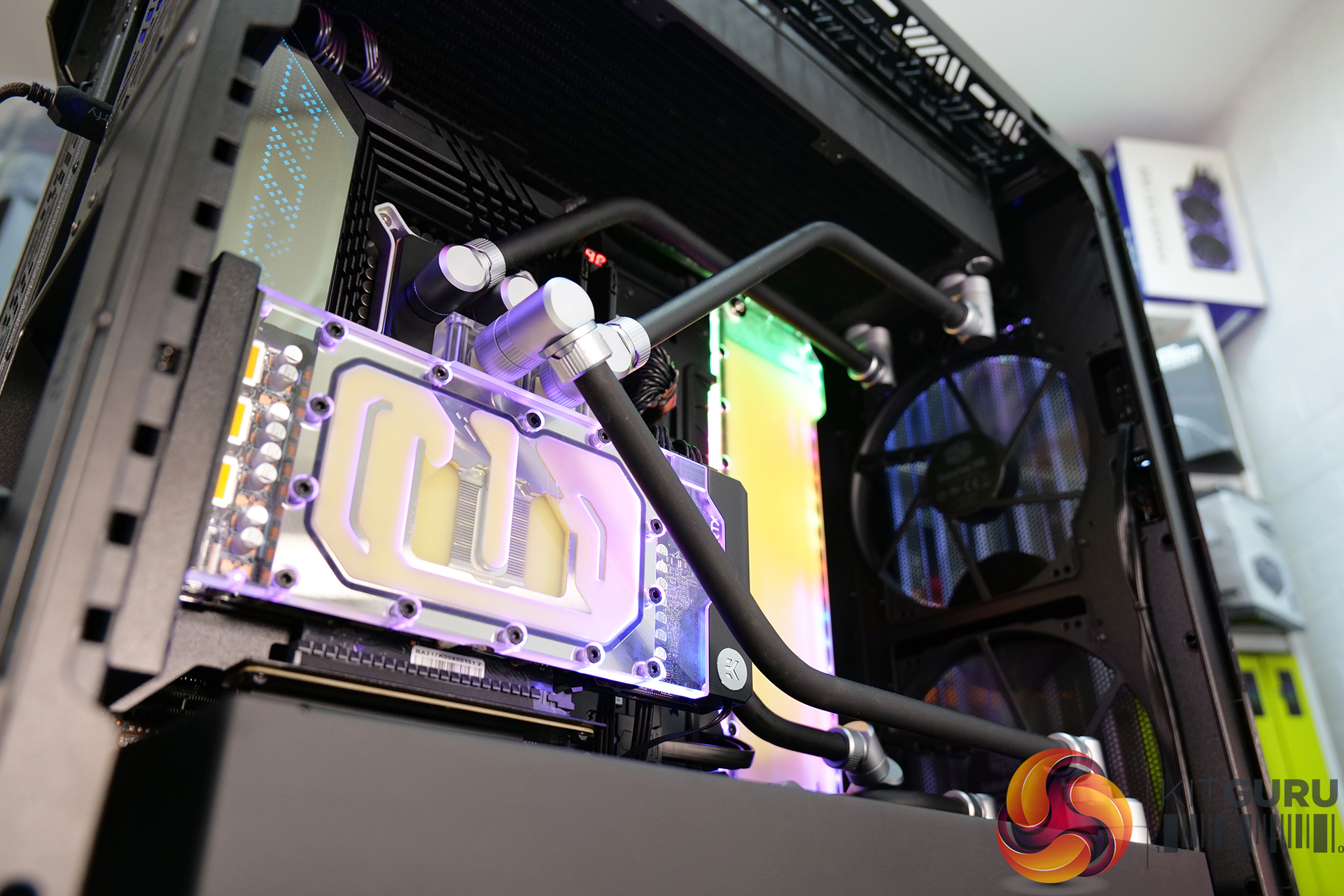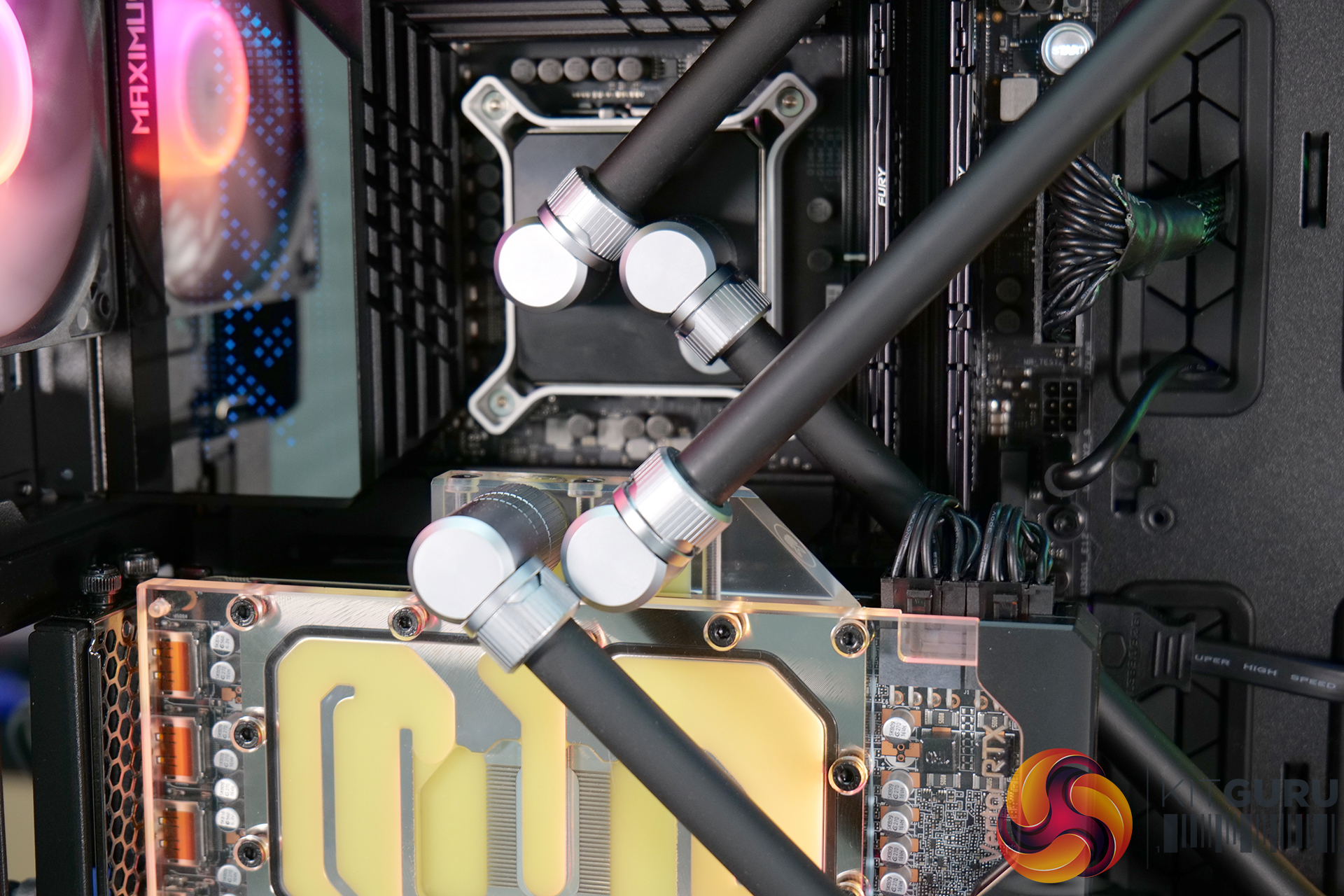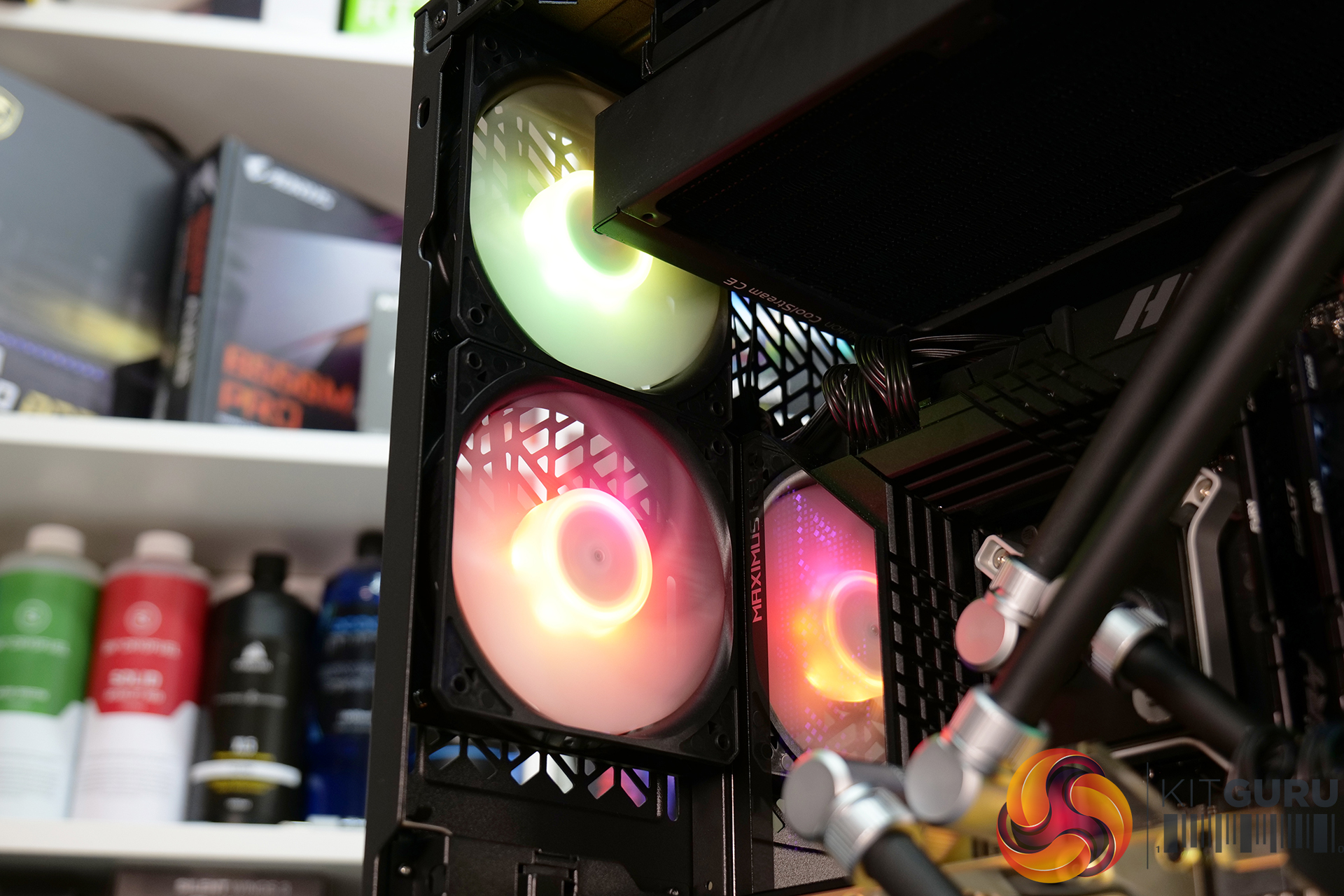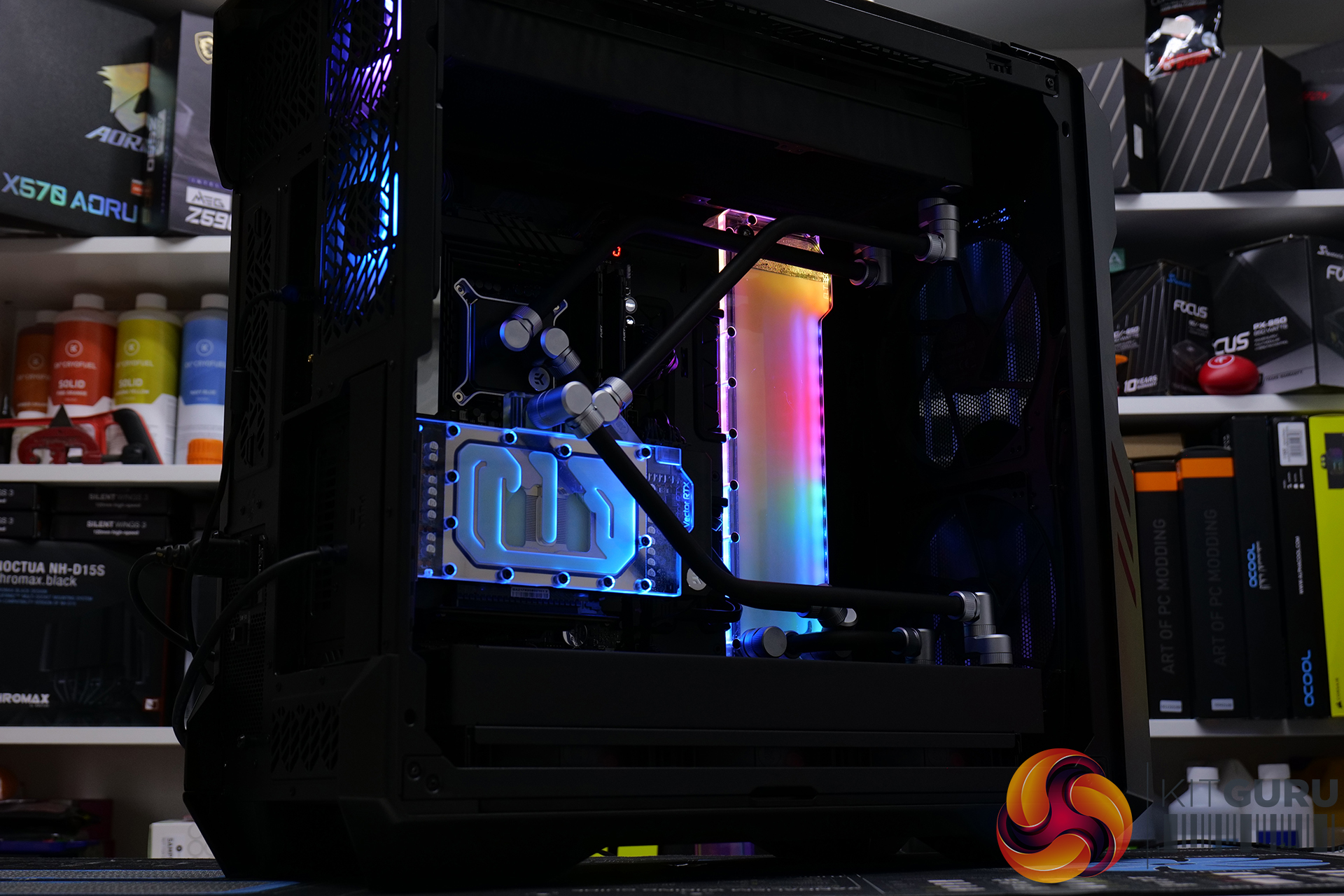 Overall though, it was a very pleasing experience installing a custom loop system inside this case. Our two 45mm-thick 420mm radiators were accommodated easily, along with the EK-Quantum Kinetic FLT 360 flat reservoir. The finished product looked great too, the EKWB RGB lighting could be easily hooked up to the chassis’ RGB controller and with minor tweaking in the Cooler Master MasterPlus+ software, the RGB synchronised perfectly.