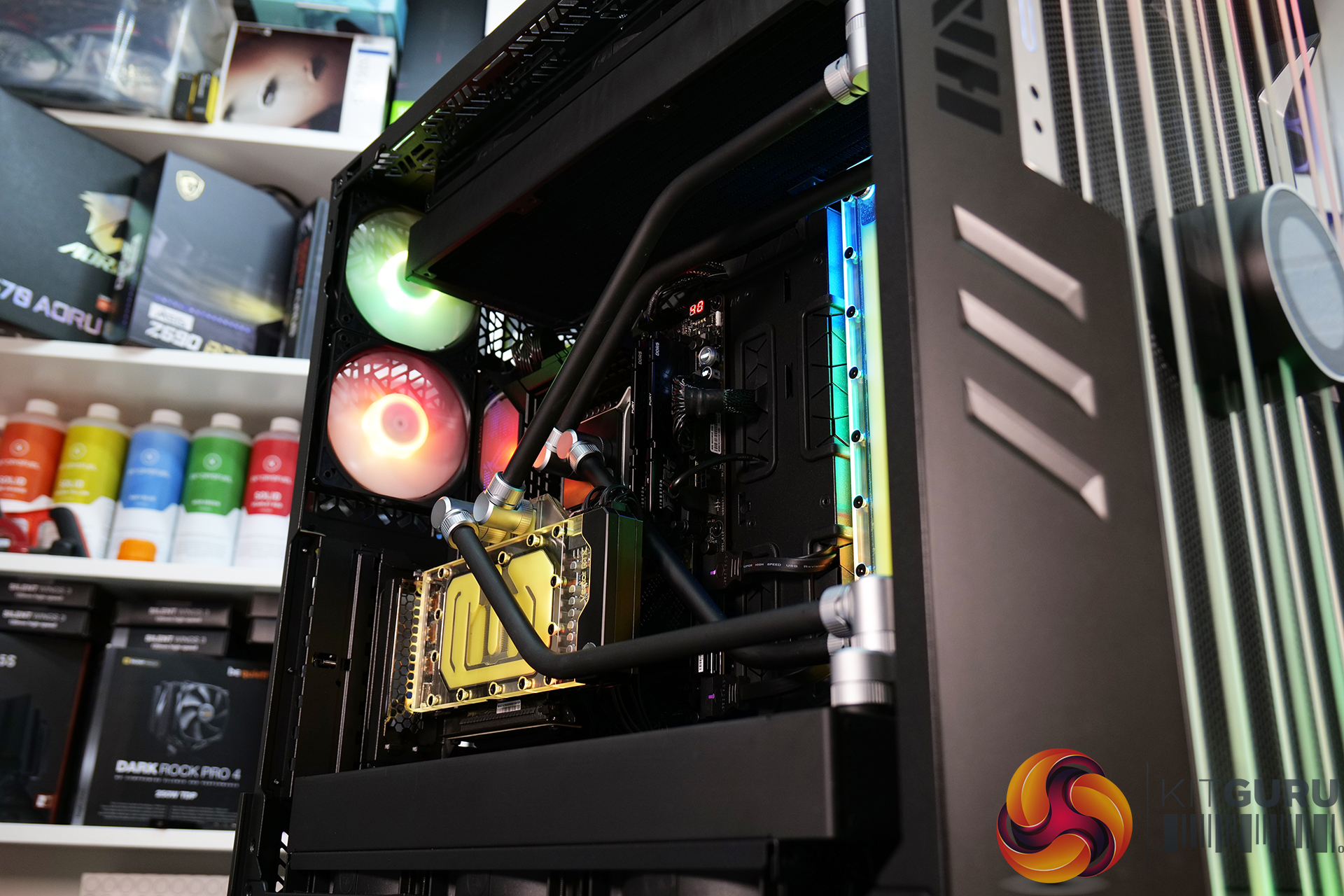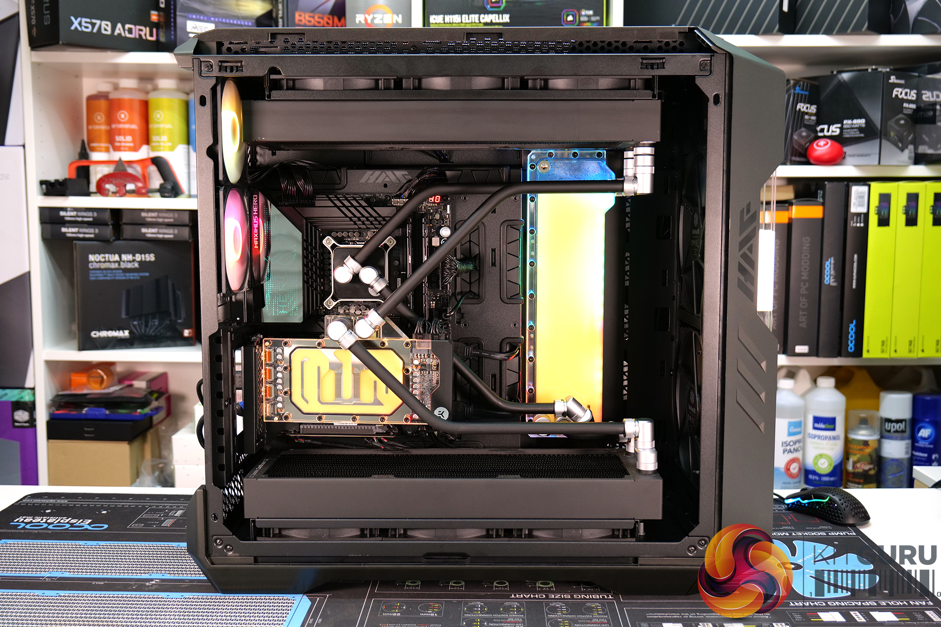 Thermal performance is measured with the case in various configurations, such as the default, with the tempered glass left-hand side panel removed and with the front panel removed to see how these configurations affect the CPU and GPU temperature. During testing, only stock case fans are used unless otherwise specified. All water pumps are set to maximum RPM and fans are set to a fixed RPM by the Motherboard software/BIOS.