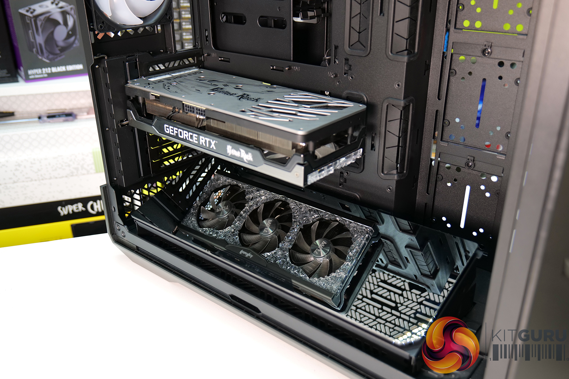 So space isn’t an issue in the HAF 700 EVO and to be honest the whole build went very smoothly. The tool-less features all worked well however, there was some interference with our 140mm fans when three were installed in the removable brackets together. A rivet head gets in the way a little which means you must force the fan bracket lid closed which marks up the fan housing.
