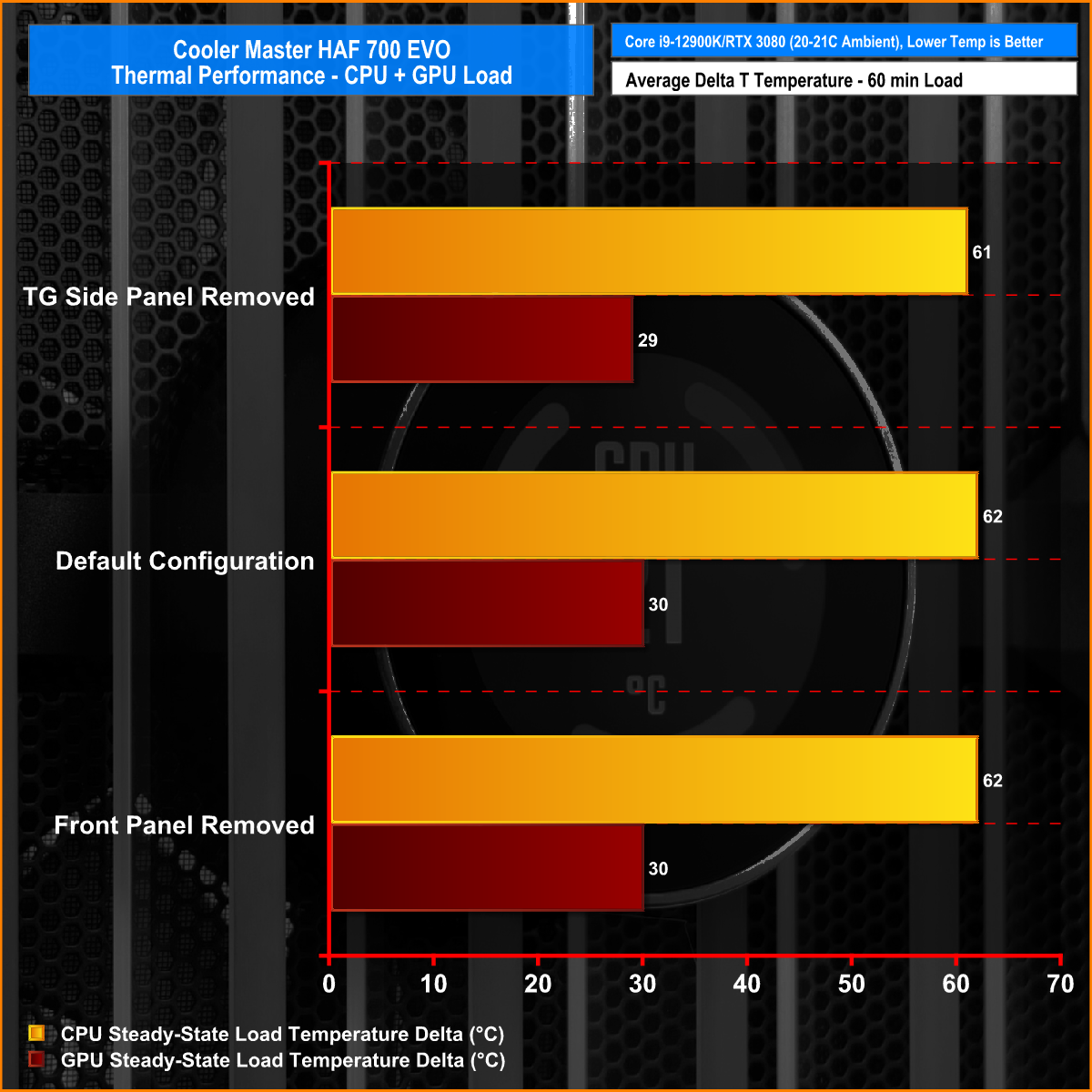 With dual 420mm radiators in a custom loop, thermal performance was always going to be good. But as you can see removing panels didn't have much, if any effect on the CPU or GPU temperature under load which shows that the HAF 700 EVO has good airflow and is able to keep a high-end system cool.