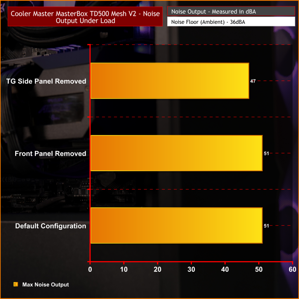 As usual with case noise testing, removing the side panel lowers noise since the fan RPM is reduced due to the cooler temperature of the components. With the case in its default configuration noise output was measured at 51dBA which could become a little distracting for some users. Manually tuning the fan curve may be required to keep noise output more comfortable.