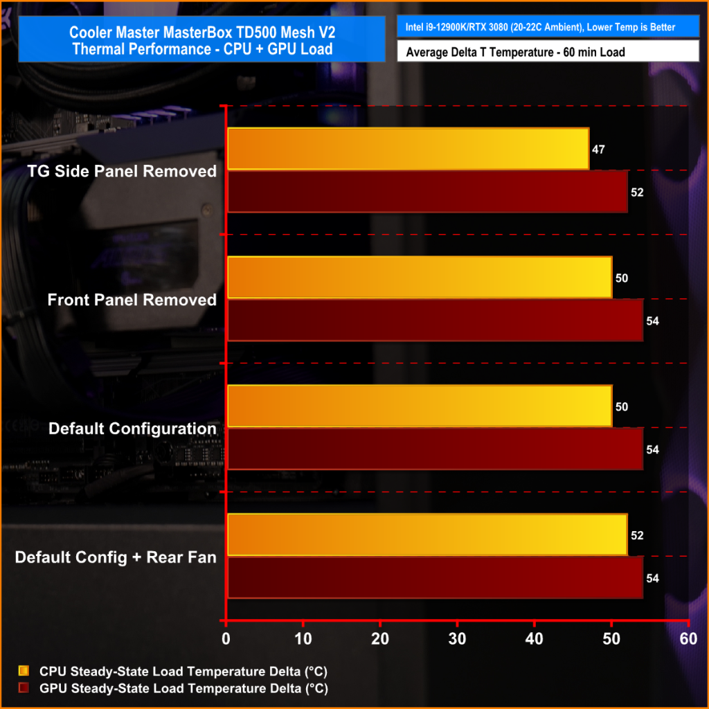 With the 12900K running at stock frequency, CPU package power is around 205W. The Cooler Master TD500 Mesh V2 was able to keep CPU temperature well under control. With the case in its default configuration, the average CPU temperature under load was at a very respectable 50°C Delta.