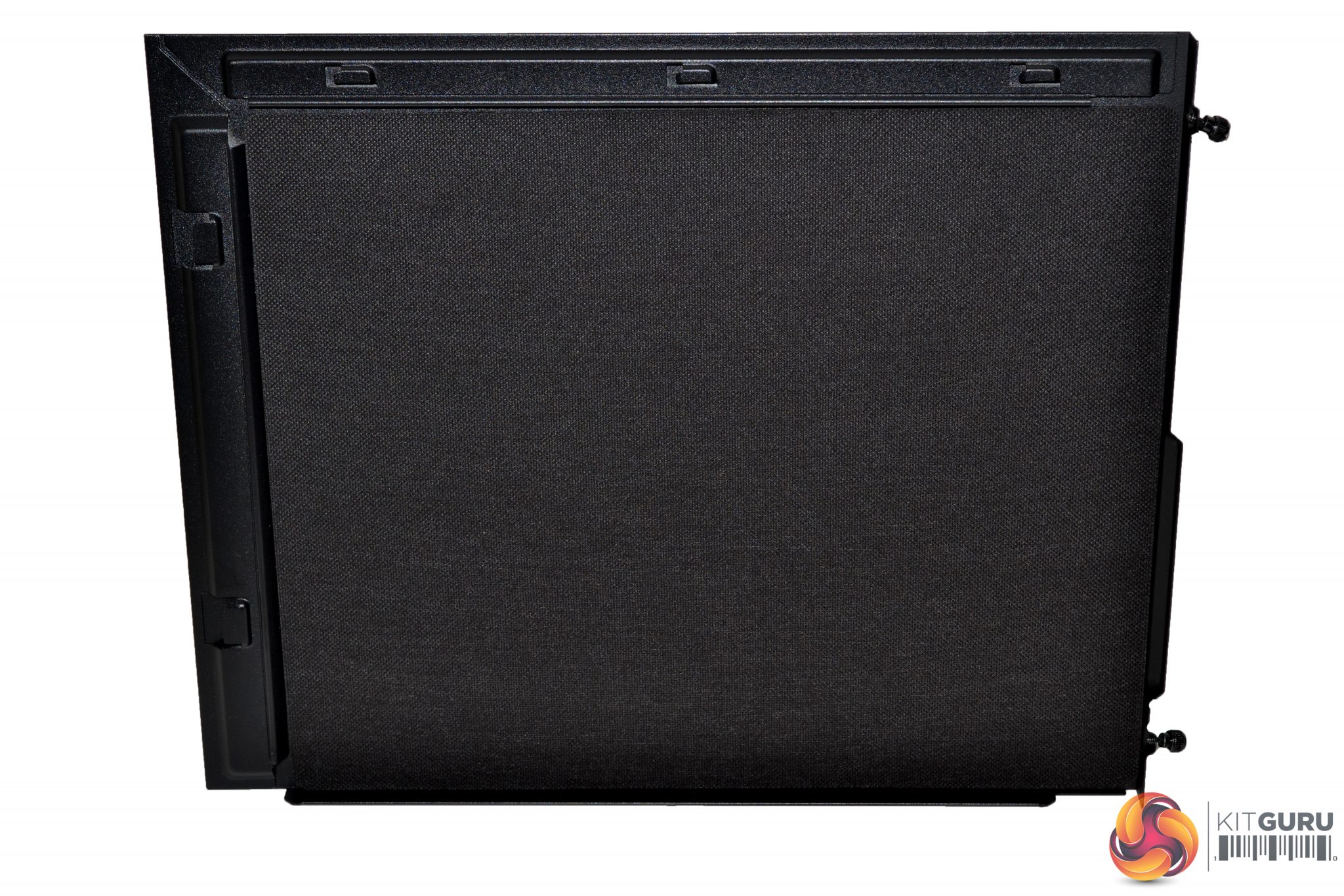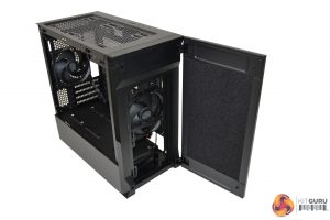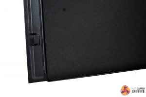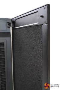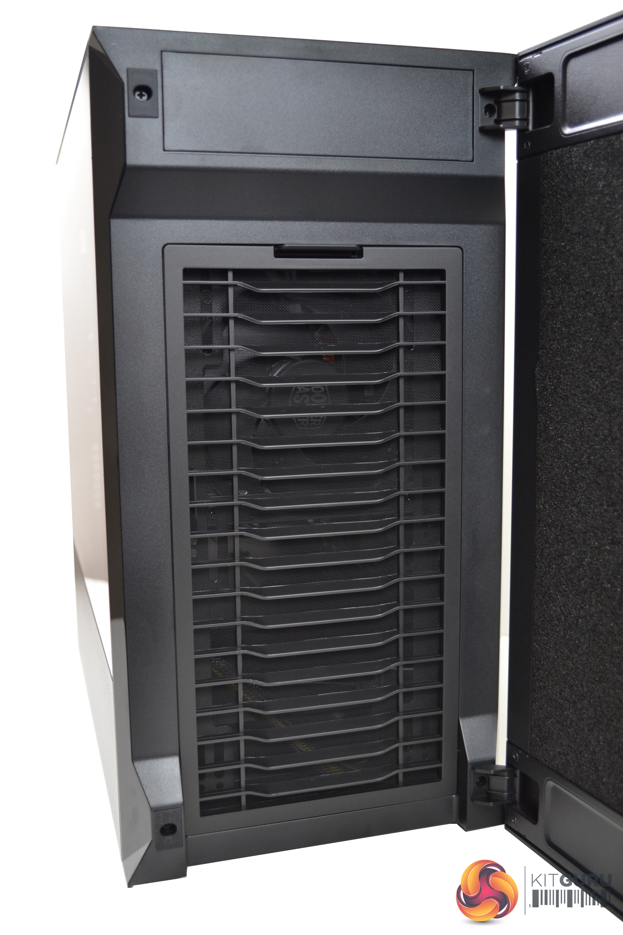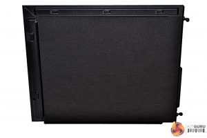 The door is primarily constructed from steel, with what appears to be a dense sponge material covering the back in an attempt to dampen noise exiting the case. Behind the door is a front panel, featuring a re-curved vent, which directs air flow from the sides and bottom with minimised turbulence. Removal of the vent offers unobstructed access to the fans.
