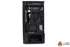 On the rear of the case, we see a typical layout – PSU mounting at the bottom, four PCI-e slots, I/O shield cut out, a 120mm/140mm fan mount, and a narrow ventilation grille right at the top. The underside of the case has four silver feet, with rubber soles, a removable mesh filter covering the PSU fan position, and various cut-outs for the 3.5” HDD cage, which mounts on the floor inside.