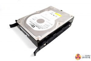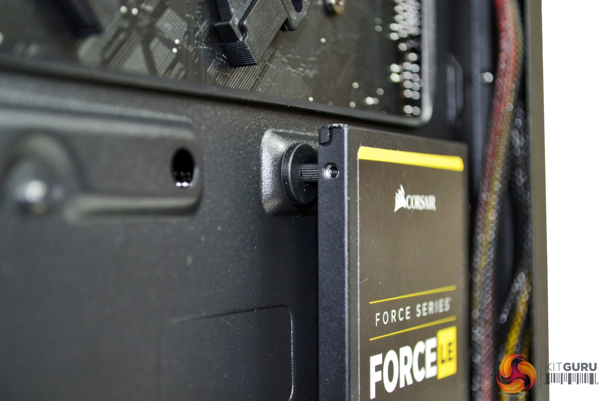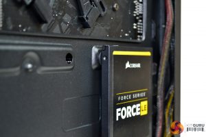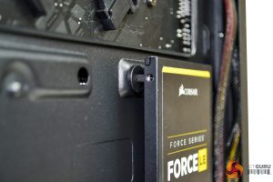 For 3.5” drive installation, we chose to use the cage mounted under the PSU shroud. Again, this is a simple tool free installation. Just take two of the plastic brackets and clip one either side of your 3.5” drive and slide the dive into the cage, until you hear it click into place.