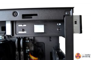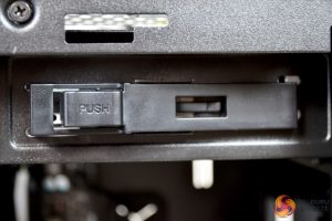 Installation of a 5.25” optical drive is also a tool free operation; a quick release plastic bracket has been implemented into the design. However, we did have issues with this falling off whenever we tried to insert the drive, as the mounting pegs didn’t seem to line up with the hole in the chassis very well. Due to this, we would recommend using screws to fix an optical drive in place.