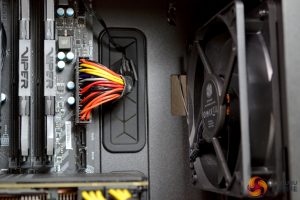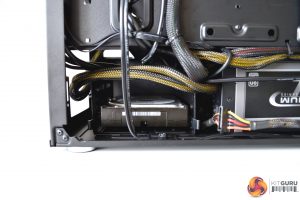 The Seasonic Platinum PSU we chose to use in this build may not have been the best. It was a very tight fit, as there was limited clearance to the 3.5” HDD cage, even with the cage in its furthest forward position. However, it did fit with some manipulation of the cables. There is always the option to remove the HDD cage completely to gain more space. Four rubber feet and a rubber seal pull sit tight to the PSU to help prevent vibration and unwanted noise.