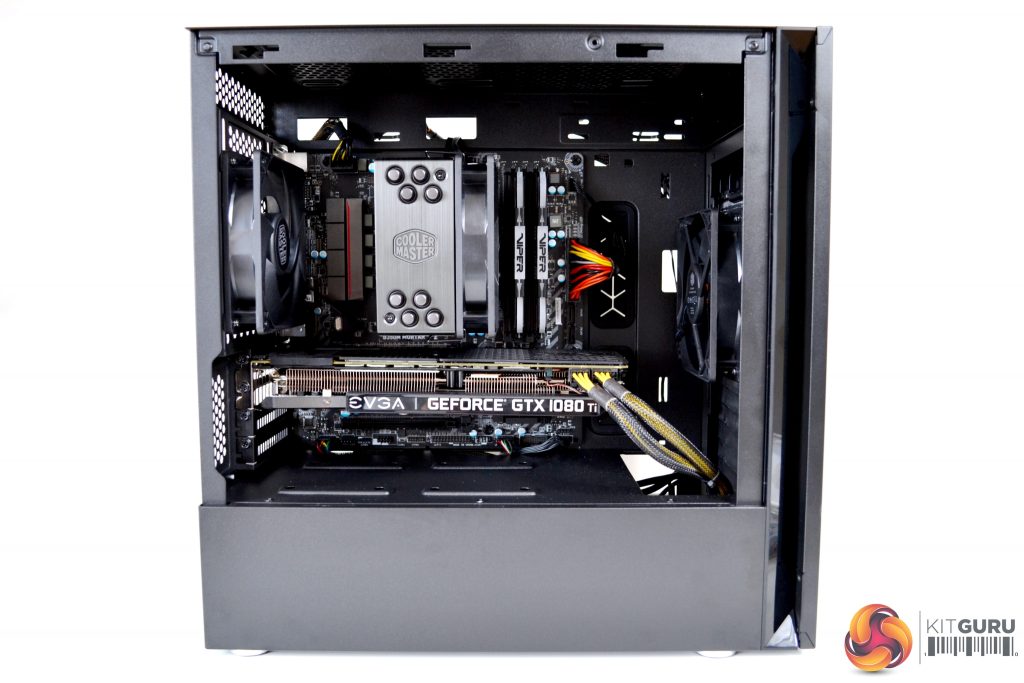 Installing a discrete GPU up to 319mm long should be manageable, as there is approximately 75mm of clearance between the motherboard and front fan. Our EVGA 1080 TI SC Black Edition fitted nicely, although it may have been a little close if a front mounted radiator was installed.