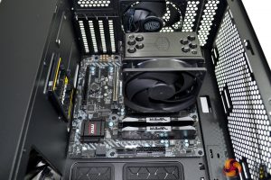 Installation of the motherboard is simple – all the pre-installed stand offs lined up correctly. It is advisable to remove either the 5.25” drive bay or the rear fan, as this will help motherboard installation when lowing it into position.