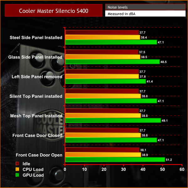 As we can see, acoustic output was barely affected by the various configurations we tested above. The most noticeable reduction in sound from the GPU was when the left side panel was completely removed. This may sound counter-intuitive but it was due to the GPU temperature reducing significantly as it was able to dissipate heat much better, therefore its fans didn't ramp up nearly as high as when the side panel was installed.