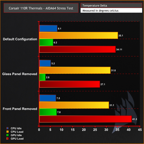 We can see from the chart that with the system in various configurations, there isn't much of a change in temperature. CPU temperature is at its lowest with the front panel removed due to better airflow to the radiator.