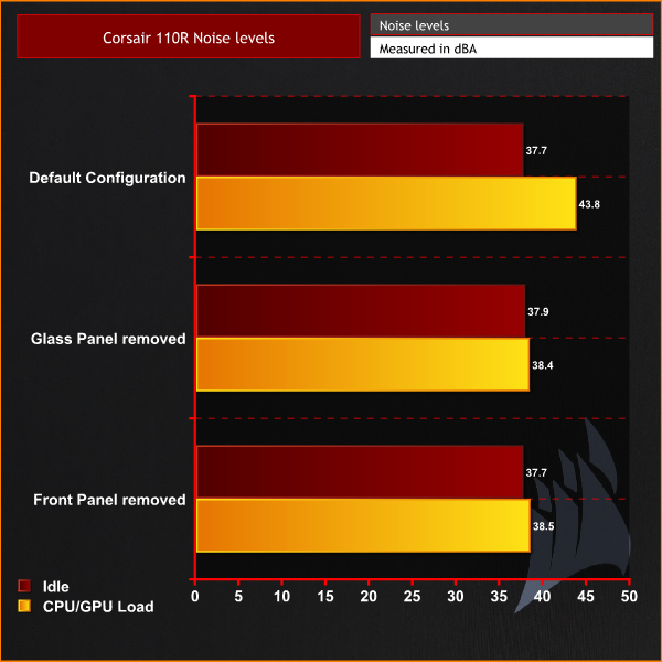 As we saw in the thermal performance tests, the Corsair 110R performs well with acoustics too. There is little difference in noise levels between the various configurations we put the case in, which means in its default configuration, the 110R is a quiet chassis. Under load, there was only a few decibels increase in noise levels, which is excellent.