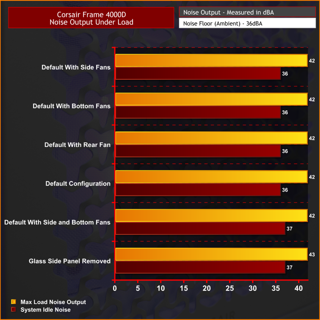 Since the Frame 4000D has great airflow and cooling, the noise output of the system with the case in its default configuration is low as the fans don’t need to ramp up too high to keep the system cool. Changing fan configuration barely changes noise output as the fan speed can be kept low even at high CPU and GPU load. Removing the glass side also did little to the system noise output as again, fan speed is always quite low even at high system load.