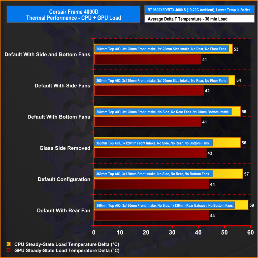 With the case in the default configuration, how it ships from Corsair with three front 120mm intake fans, both the CPU and GPU average temperature look great at 57ºC and 44ºC over ambient. The airflow is so well optimised that removing the glass side panel has little effect on temperatures.