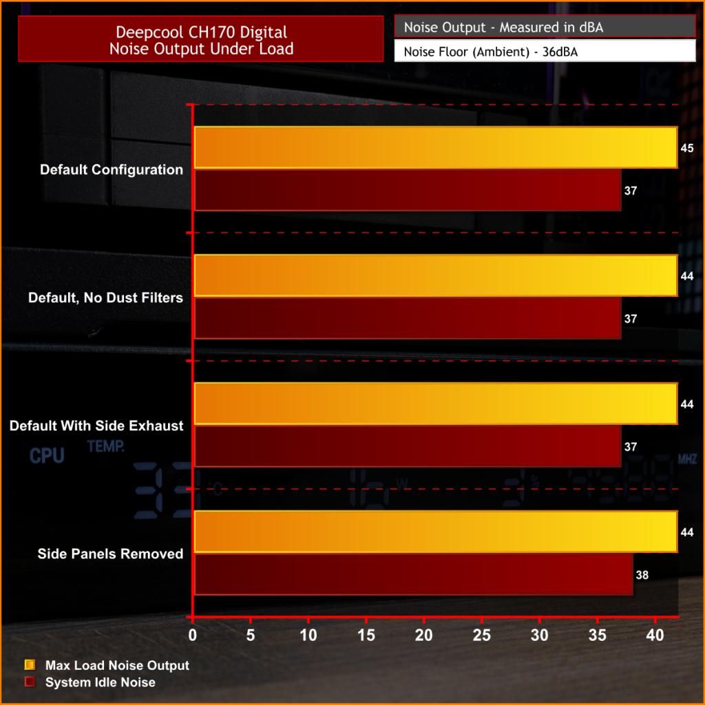 When changing the case configuration temperature remains reasonably consistent so noise output is virtually unaffected. Due to the optimal airflow and cooling, the CPU fan curve doesn’t need to be too aggressive, even under this intensive CPU and GPU load, maximum noise output in our test environment peaks at 45dBA which is noticeable but not too distracting.